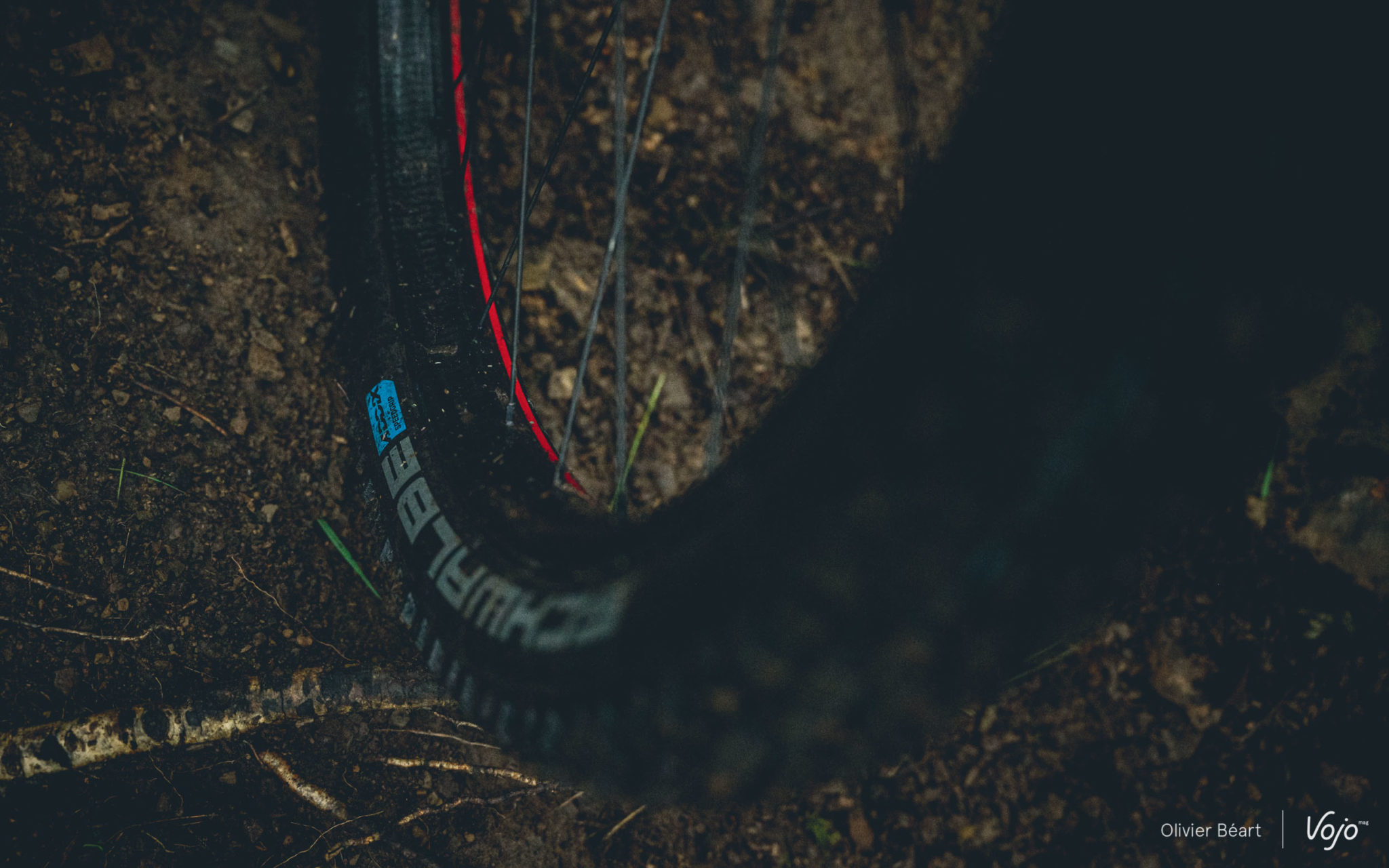 Le montage sur nos roues Zipp a nécessité un peu de poigne, comme avec pas mal de pneus Schwalbe récents sur lesquels on sent que la marque a voulu jouer la carte de la solidité et de la rigidité au niveau de la carcasse. Néanmoins, nous sommes arrivés assez rapidement à nos fins, et le gonflage s’est avéré très facile. Nous avons commencé à rouler avec une pression de 1.3 bars devant et 1.4 bars derrière, mais nous sommes rapidement descendus à 1.1 devant et 1.2 derrière car la carcasse est fort rigide et, si on ne descend pas assez en pression, on a l’impression de manquer de grip car le pneu rebondit et n’enrobe pas assez les reliefs, y compris sur un e-bike, pourtant plus lourd. En laissant un peu de temps au pneu pour se « roder » et en n’ayant pas peur de descendre en pression, on oublie ensuite ce phénomène.