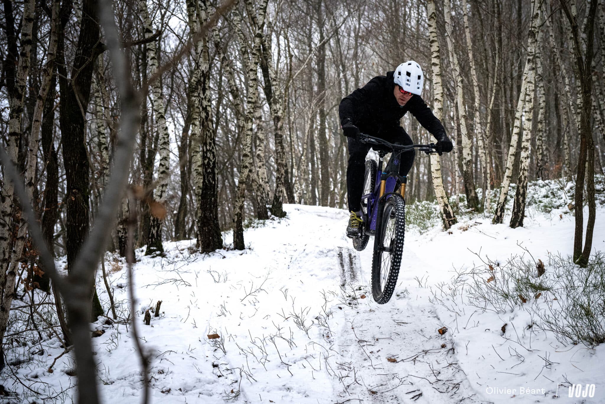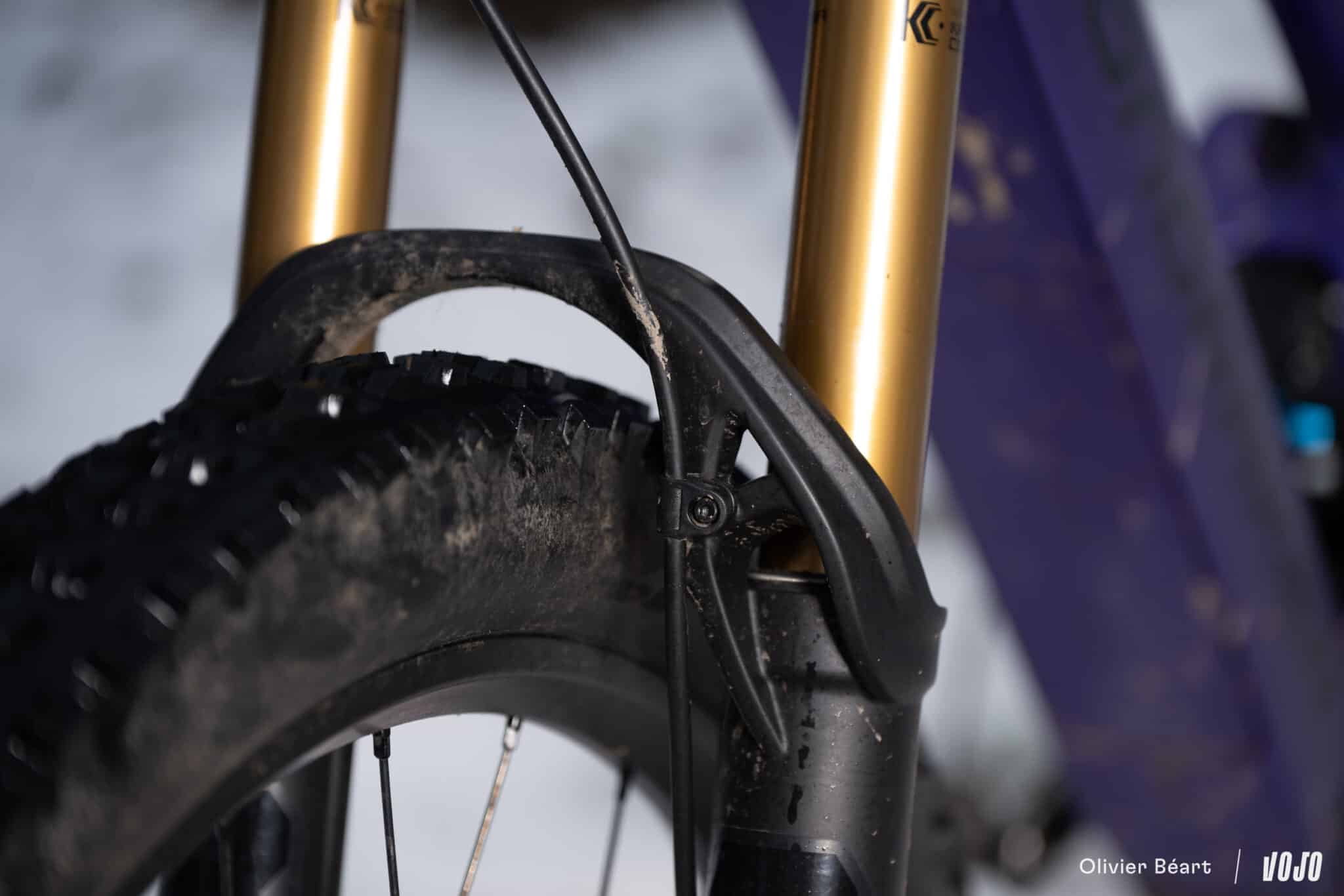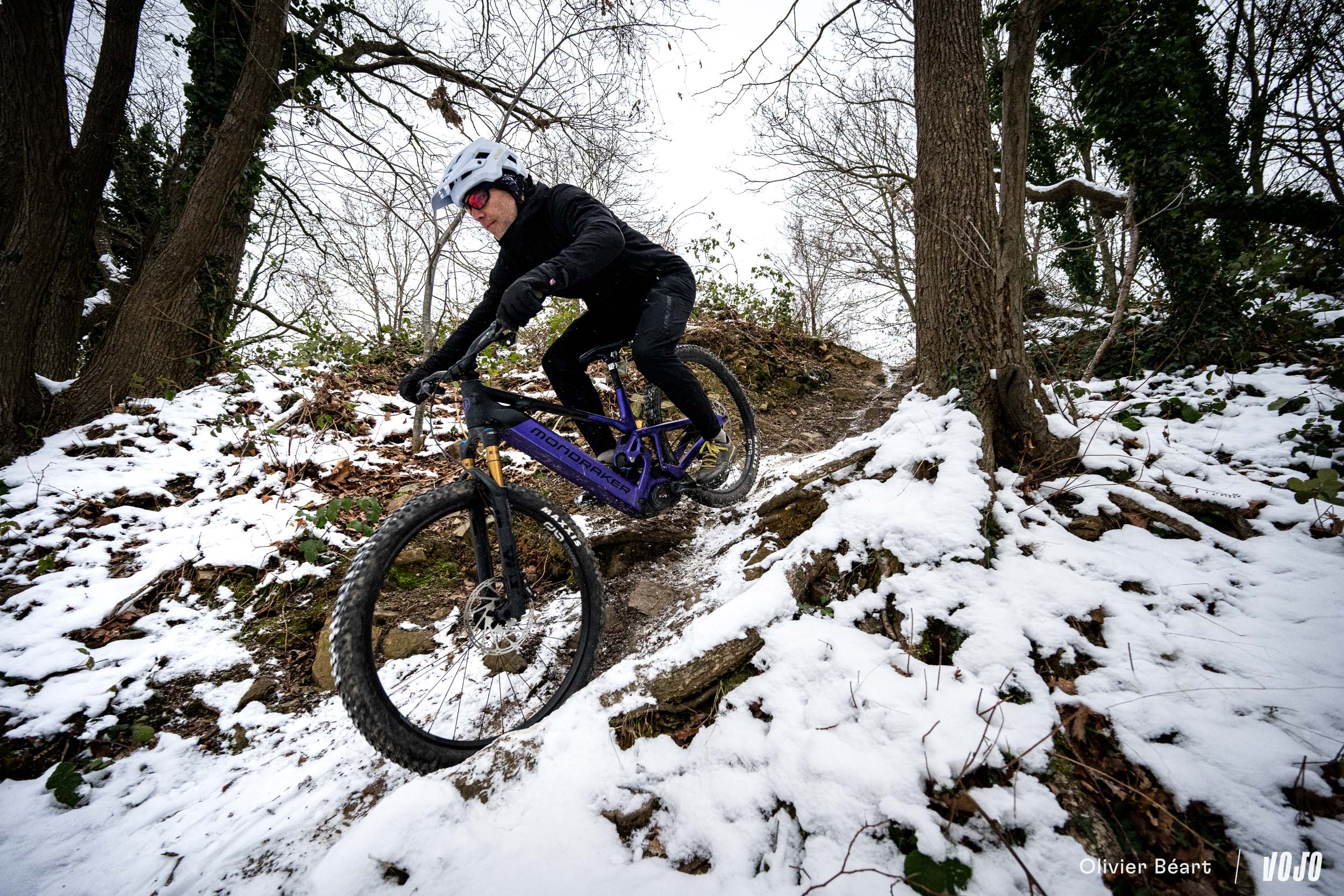 La seule grosse fausse note se situe au niveau du choix du pneu avant. Si le Maxxis Dissector est plutôt agréable à l’arrière, grâce à un bon compromis entre la traction qu’il offre et une résistance au roulement plutôt faible, il est en revanche limite dangereux à l’avant quand le sol n’est pas parfaitement sec. Heureusement, cela se change facilement et nous avons roulé la majorité de notre test hivernal avec d’autres modèles plus adaptés aux conditions humides et plus sécurisants. Par contre, nous avons trouvé les roues E13 tout à fait en phase avec le vélo et leur rigidité pas trop importante fait bien echo à celle de la fourche et du châssis.