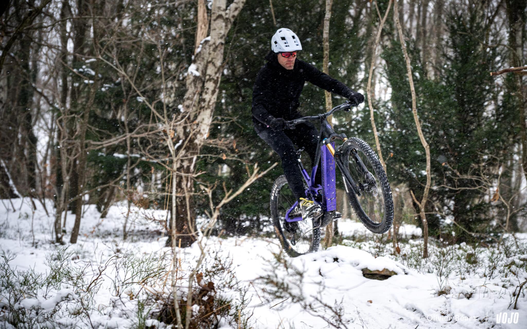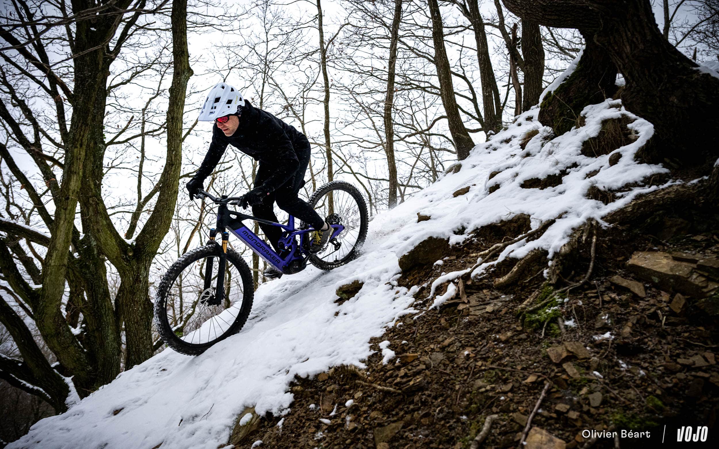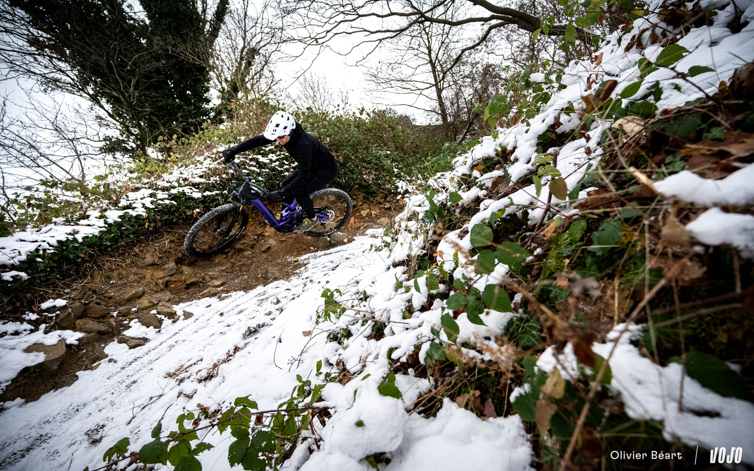 La seule grosse fausse note se situe au niveau du choix du pneu avant. Si le Maxxis Dissector est plutôt agréable à l’arrière, grâce à un bon compromis entre la traction qu’il offre et une résistance au roulement plutôt faible, il est en revanche limite dangereux à l’avant quand le sol n’est pas parfaitement sec. Heureusement, cela se change facilement et nous avons roulé la majorité de notre test hivernal avec d’autres modèles plus adaptés aux conditions humides et plus sécurisants. Par contre, nous avons trouvé les roues E13 tout à fait en phase avec le vélo et leur rigidité pas trop importante fait bien echo à celle de la fourche et du châssis.