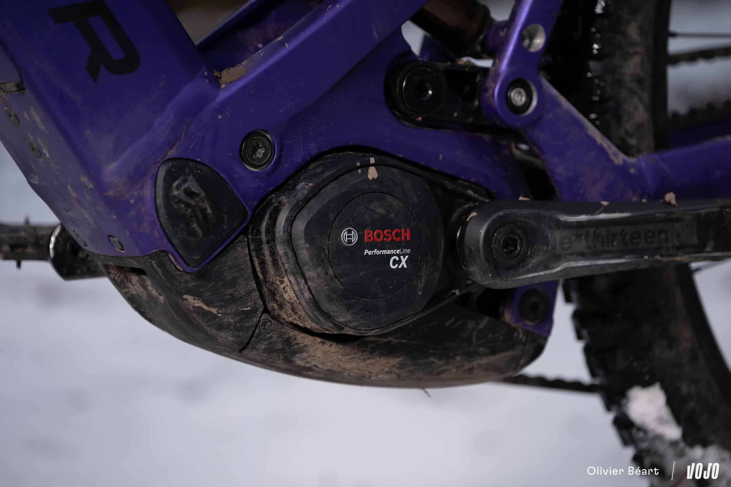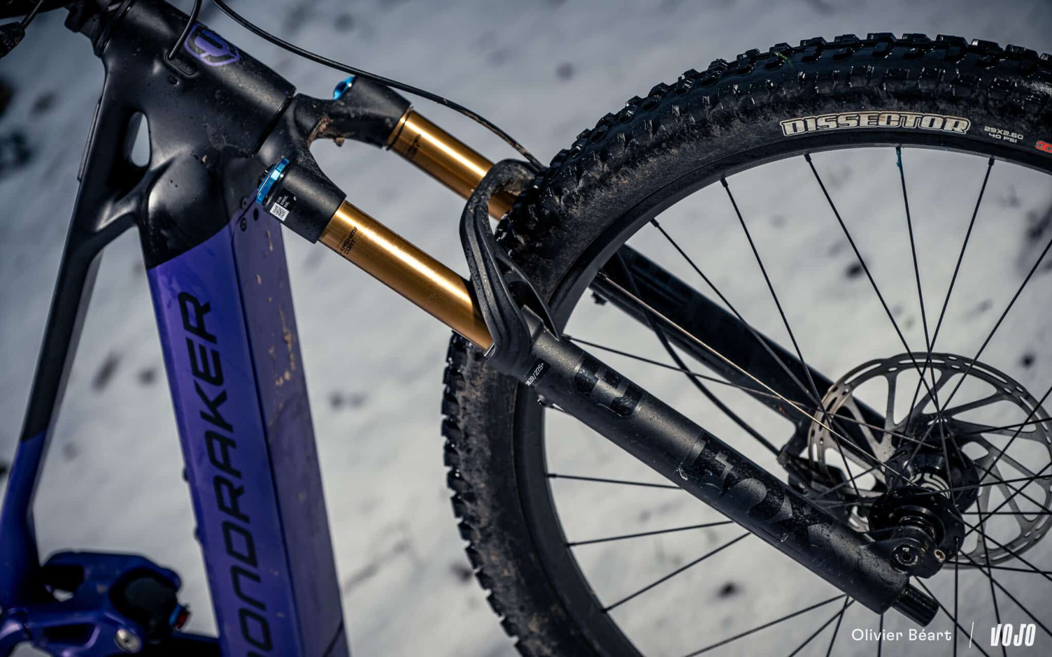 Nous avons ici testé la version haut de gamme, qui a la chance de disposer de l’excellente fourche Fox 36 Grip X2 Factory. Elle bénéficie de l’hydraulique et du ressort dernier cri de chez Fox, mais dans un châssis plus tolérant que sur la 38. Jamais nous n’avons eu l’impression d’un avant manquant de précision malgré cette fourche plus « petite » que la 38 qu’on retrouve sur beaucoup d’e-bikes, mais par contre, nous avons profité d’une plus grande tolérance, d’une fourche avec laquelle on lit plus facilement le terrain et qui n’oblige pas à tenir en permanence le vélo ou à mettre de gros appuis pour en exploiter le potentiel.