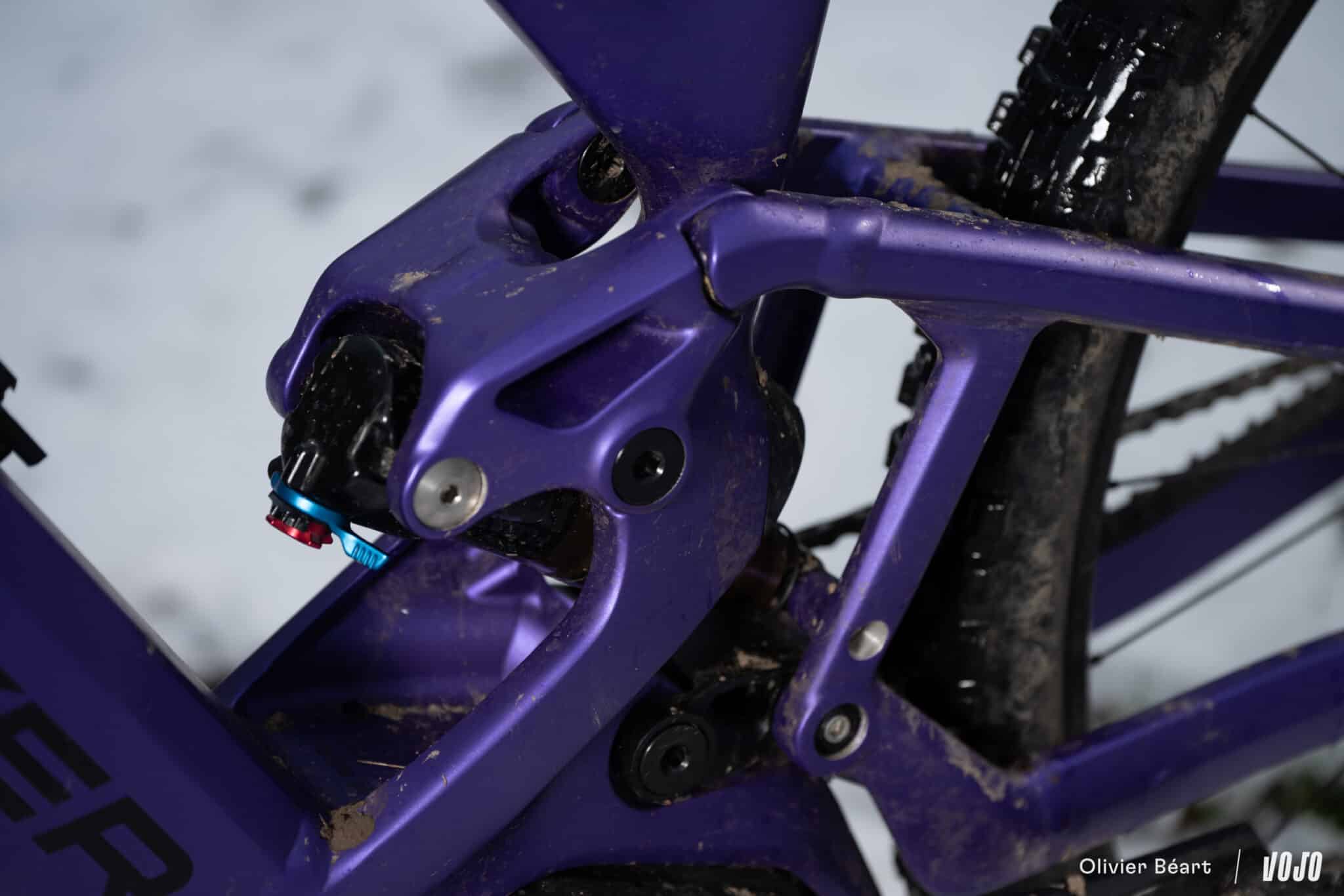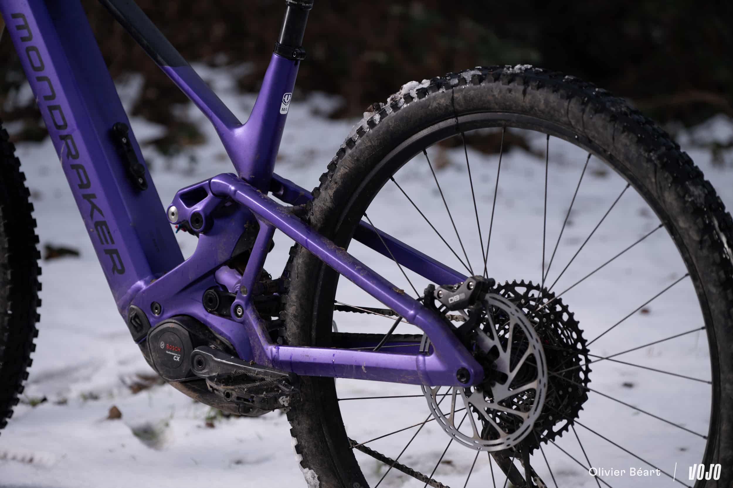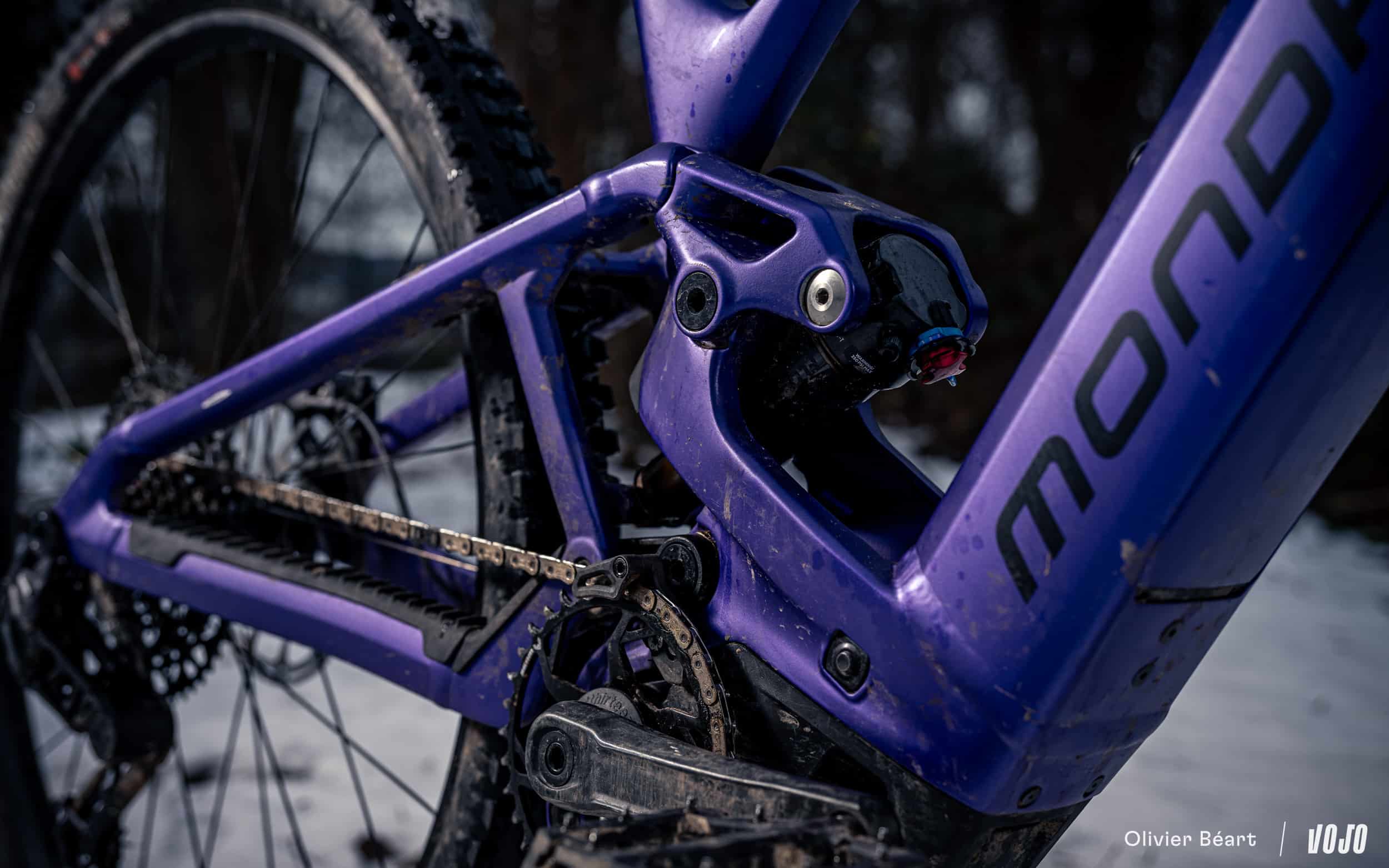 Le soin apporté à la protection du cadre mérite également d’être souligné. Mondraker a intégré de nombreuses protections en plastique et en caoutchouc aux endroits sensibles, que ce soit sous le tube diagonal, autour du moteur ou sur les bases, afin de préserver le cadre. C’est également le cas au niveau de l’amortisseur qui bénéficie d’une protection intégrée, discrète mais efficace, qui limite les projections de boue et de gravillons tout en participant à la durabilité de l’ensemble.