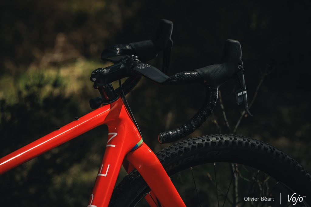 Comme toutes les réalisations de la marque, le cadre est en carbone et il est très léger : 1170g vérifiés en taille L (465g pour la fourche). Mais quand on parle de la réalisation à Gérard Vrooment, plutôt que d’utiliser des noms comme HM, Aerospace Grade ou autres, il préfère parler de l’utilisation du bon type de carbone au bon endroit. « Nous utilisons le plus haut module de carbone possible la plupart du temps car c’est lui qui offre le meilleur compromis poids/rigidité, mais quand il le faut, nous utilisons d’autres types de fibres pour augmenter la résistance aux impacts sur les parties critiques, ou encore pour faciliter la déformation de certaines zones. »