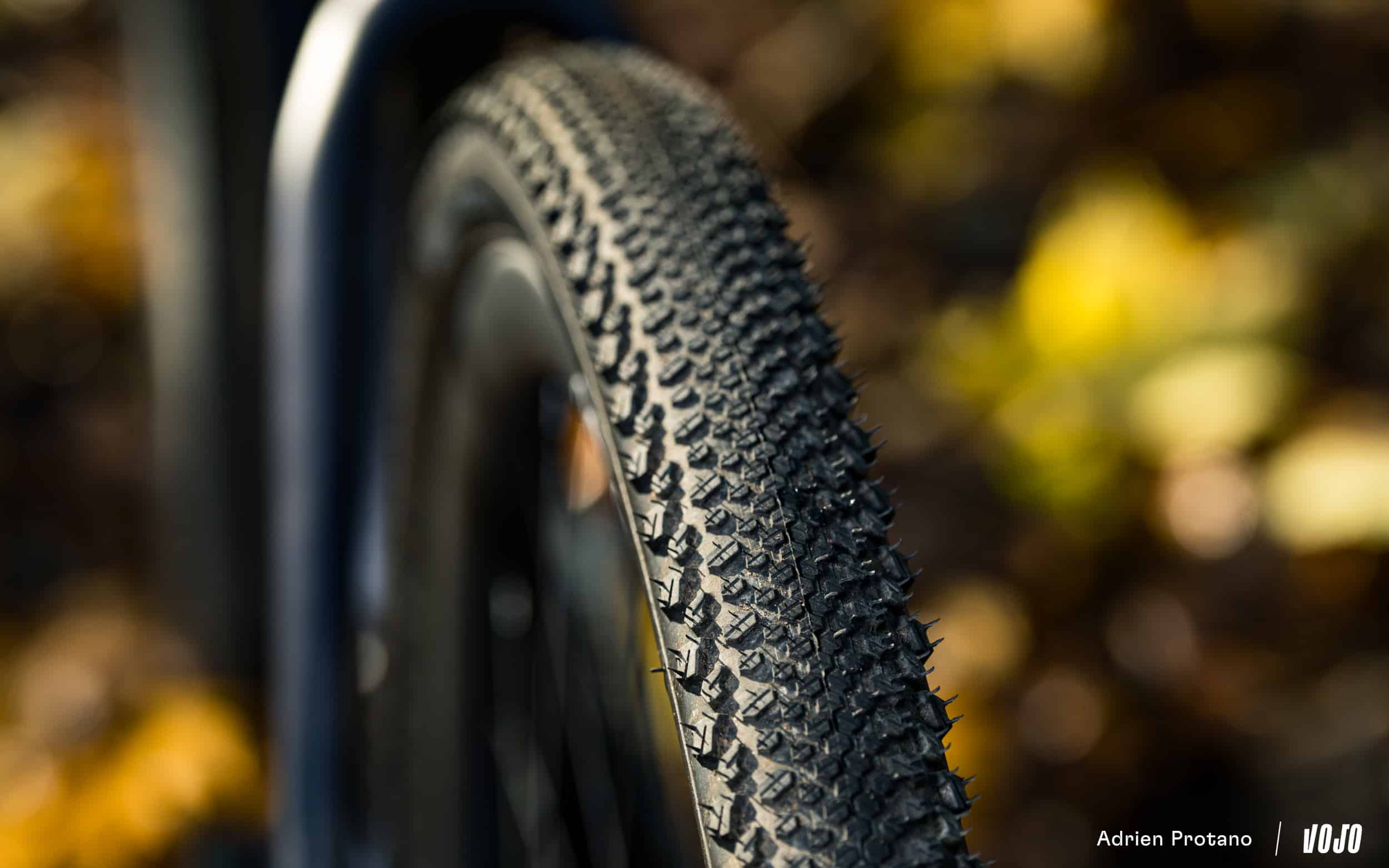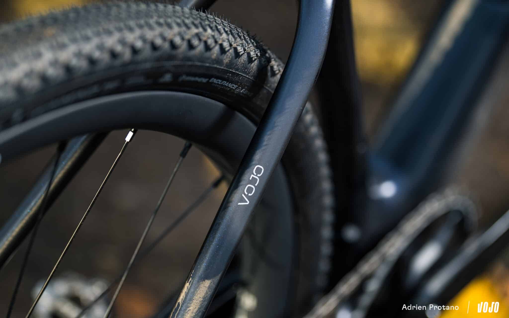 La question revient souvent, et nous n’en avons pas encore parlé : l’Orbea Terra offre un grand dégagement pour les pneus. D’origine, il est livré avec des gommes de 45mm de large, mais il est possible officiellement de monter à 50mm en gardant un bon dégagement de chaque côté. Officieusement, on vous glisse que nous avons essayé des Schwalbe en G-One RS en 55mm et même des pneus VTT en 2.1, sans le moindre souci.