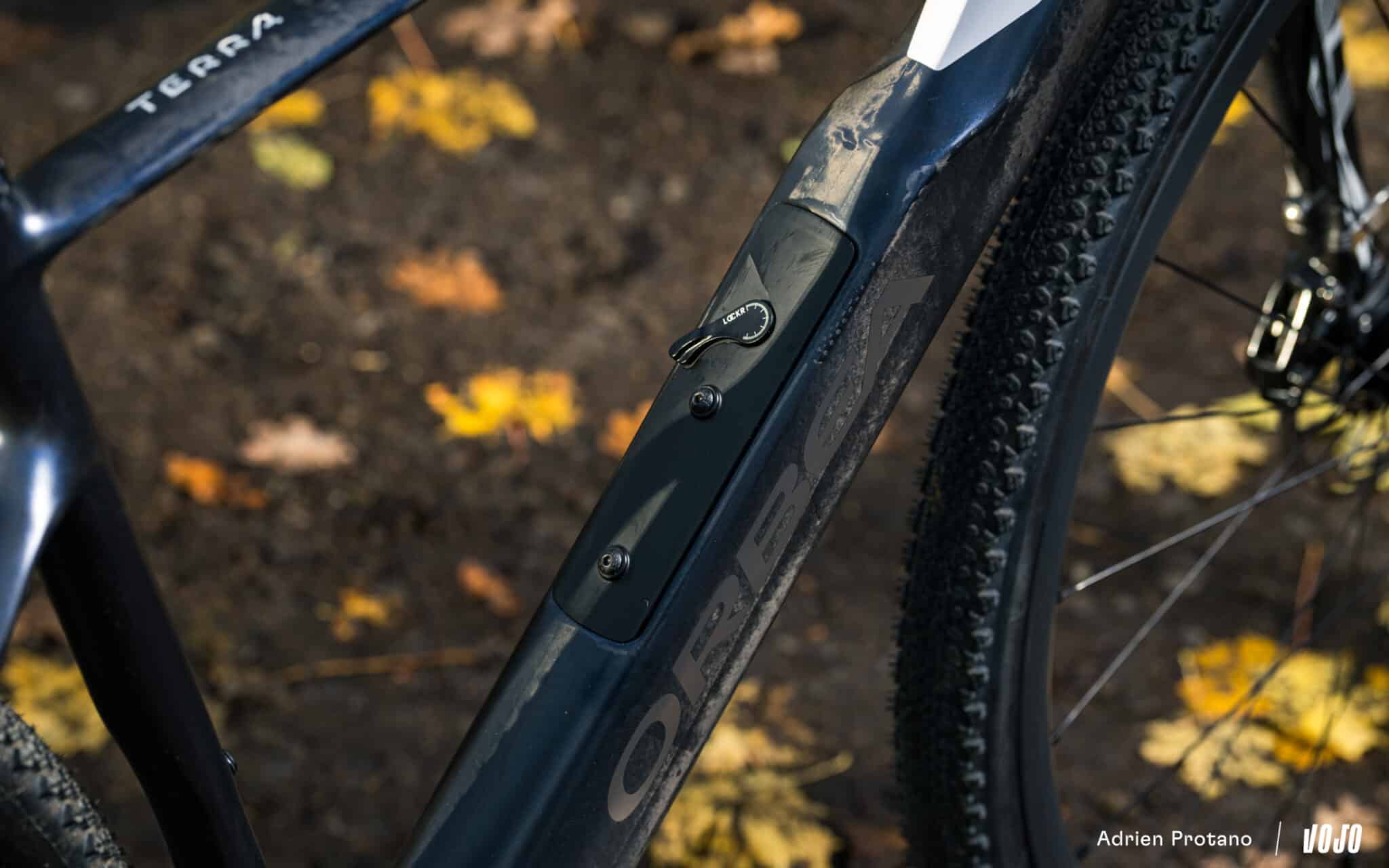 Toujours dans le stockage, on voit qu’Orbea a pensé le Terra pour l’aventure au niveau des nombreux points de fixation qui sont présents sur le vélo, tant au niveau de la fourche que sur le cadre. Ils permettront d’attacher de la bagagerie solidement, et le cadre est prévu pour être chargé aussi dans le triangle avant.