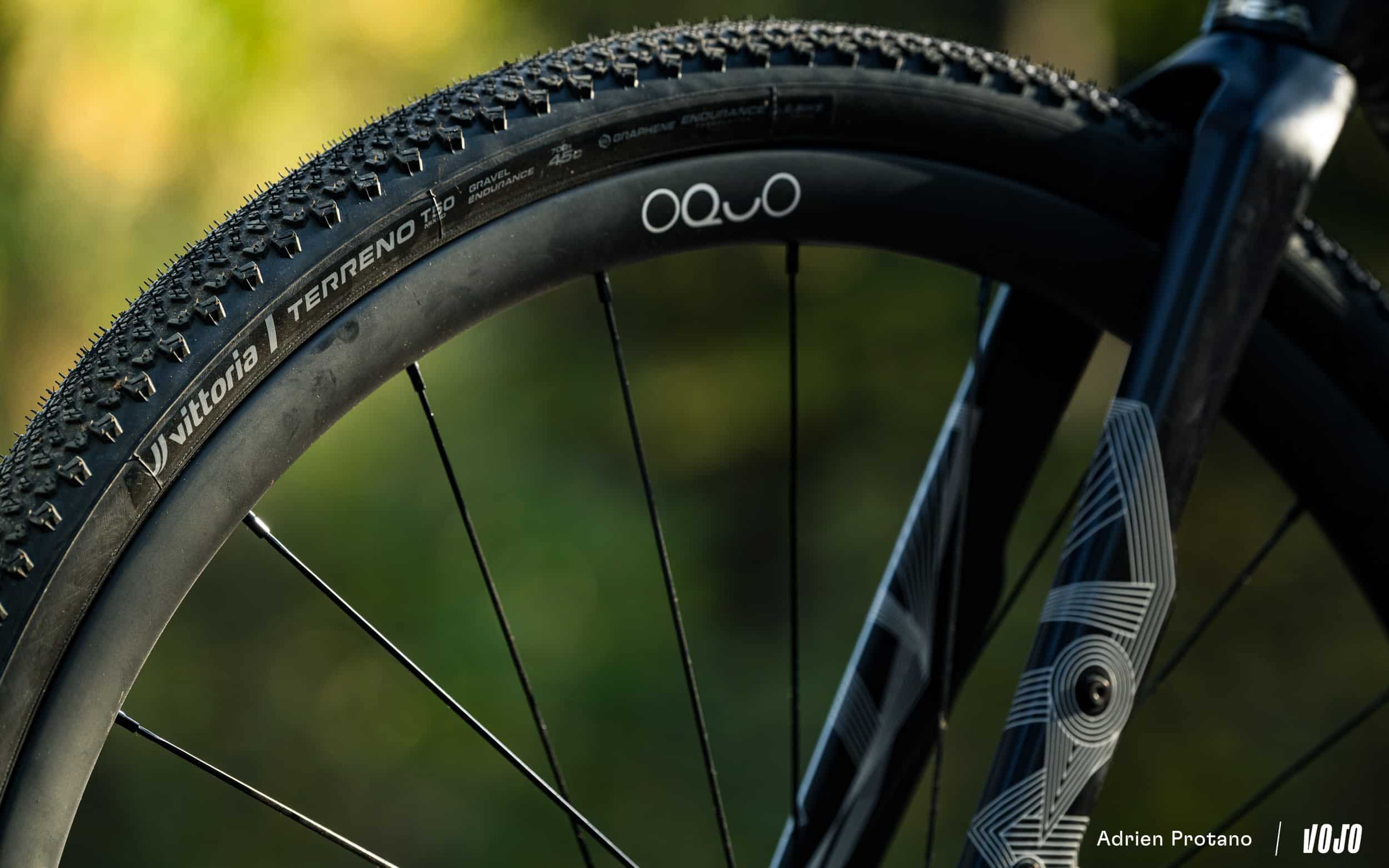 A ce stade, il nous faut évoquer les roues. La monte d’origine Oquo RC30 se veut polyvalente et, sur papier, elle colle parfaitement avec le programme du Terra. Sur le terrain, il est difficile de leur faire de vrais reproches… mais il est aussi difficile de leur trouver de grandes qualités. Si le cadre donne souvent envie de dire « waow ! », ce n’est pas le cas des roues. Pour en avoir le cœur net, nous avons monté d’autres roues sur le Terra et nous avons pu constater qu’un combo de roues haut de gamme à jantes hautes (50mm) avec des pneus en 55mm lui va à ravir ! La perte en confort est largement compensée par les pneus plus gros mais par contre on a un vélo encore plus performant et capable de filer encore plus vite sur les portions roulantes. Grisant !