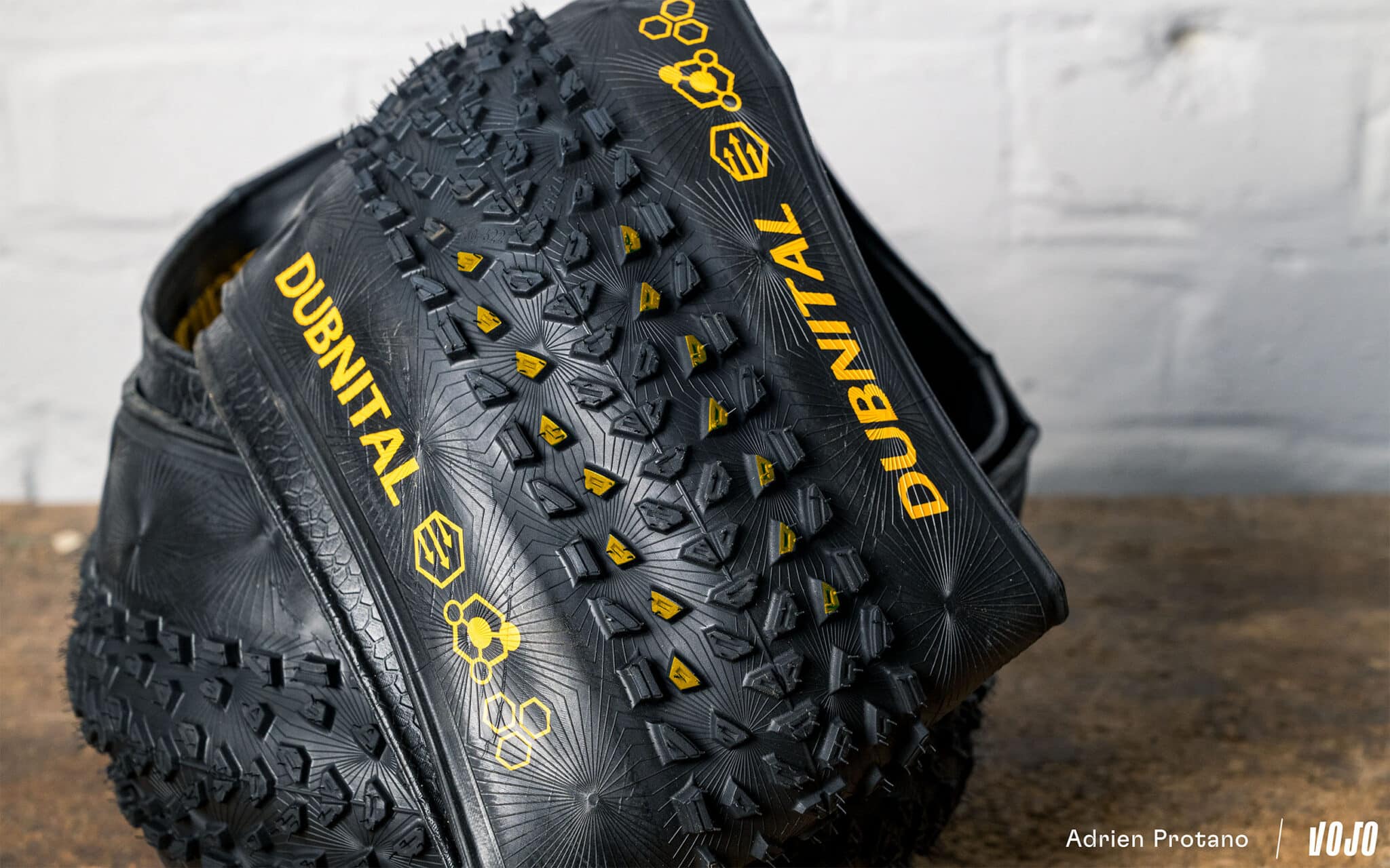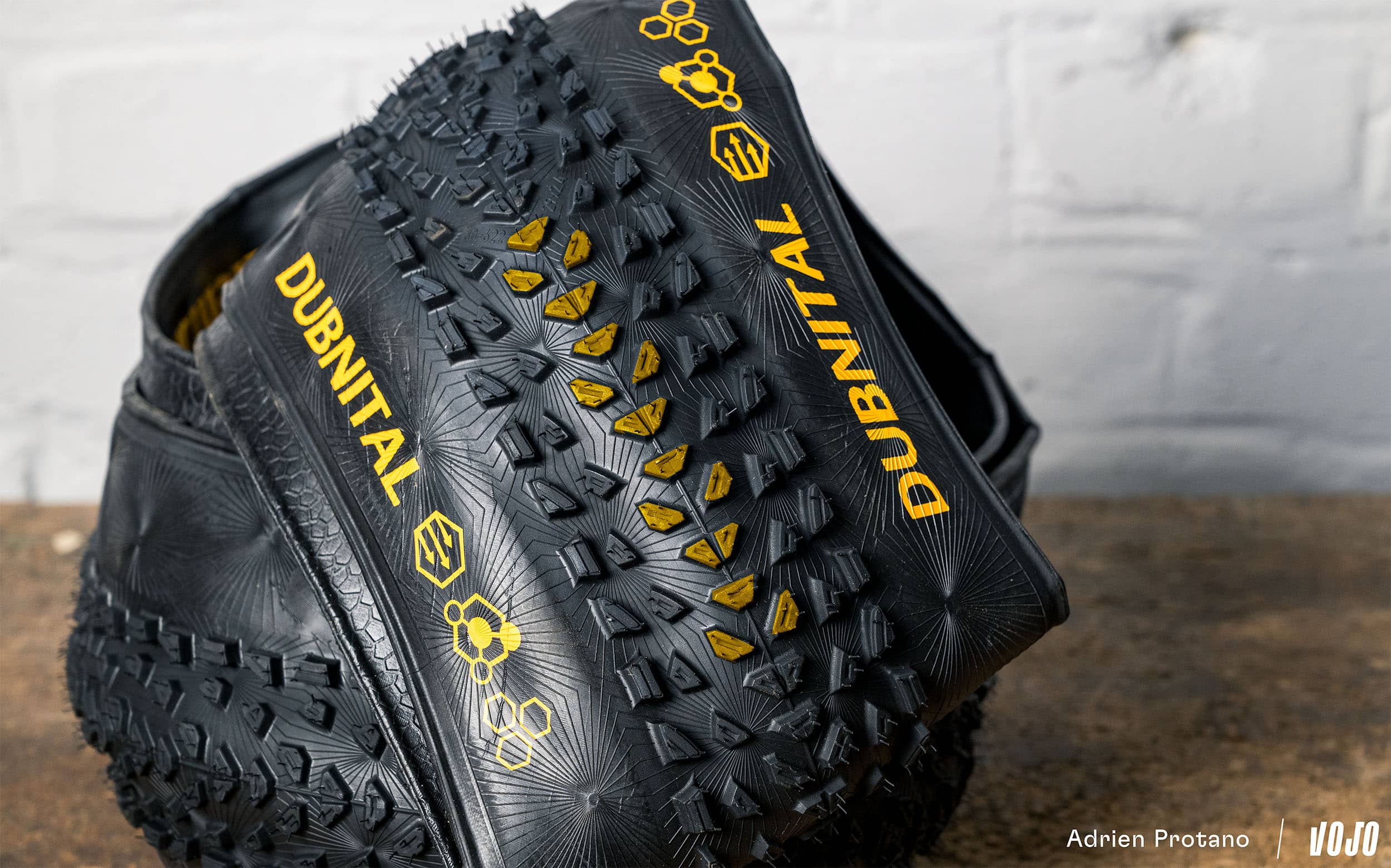 Descendant direct du fameux Race King, le Dubnital se caractérise par des crampons bas au niveau de la bande de roulement (zone centrale jaune sur la photo), pensés pour un rendement maximal sur des terrains plutôt secs et durs.