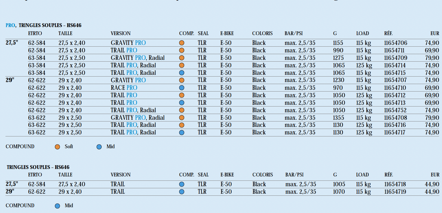 En regardant le tableau des différentes versions disponibles, on se rend compte que l’offre est large, avec deux diamètres de roues (27,5 et 29), deux sections (2.4 et 2.5), deux types de gommes (Mid et Soft), trois carcasses (Race, Trail et Gravity) et deux constructions (classique ou radiale). Tout cela est valable pour les versions Pro haut de gamme dont les prix sont compris entre 69,90 € et 79,90 €, mais n’oublions pas qu’il y a aussi une version plus simple à 44,9 € disponible uniquement en 2.4 de section et gomme Mid, mais bien en 27,5 et 29 pouces de diamètre.