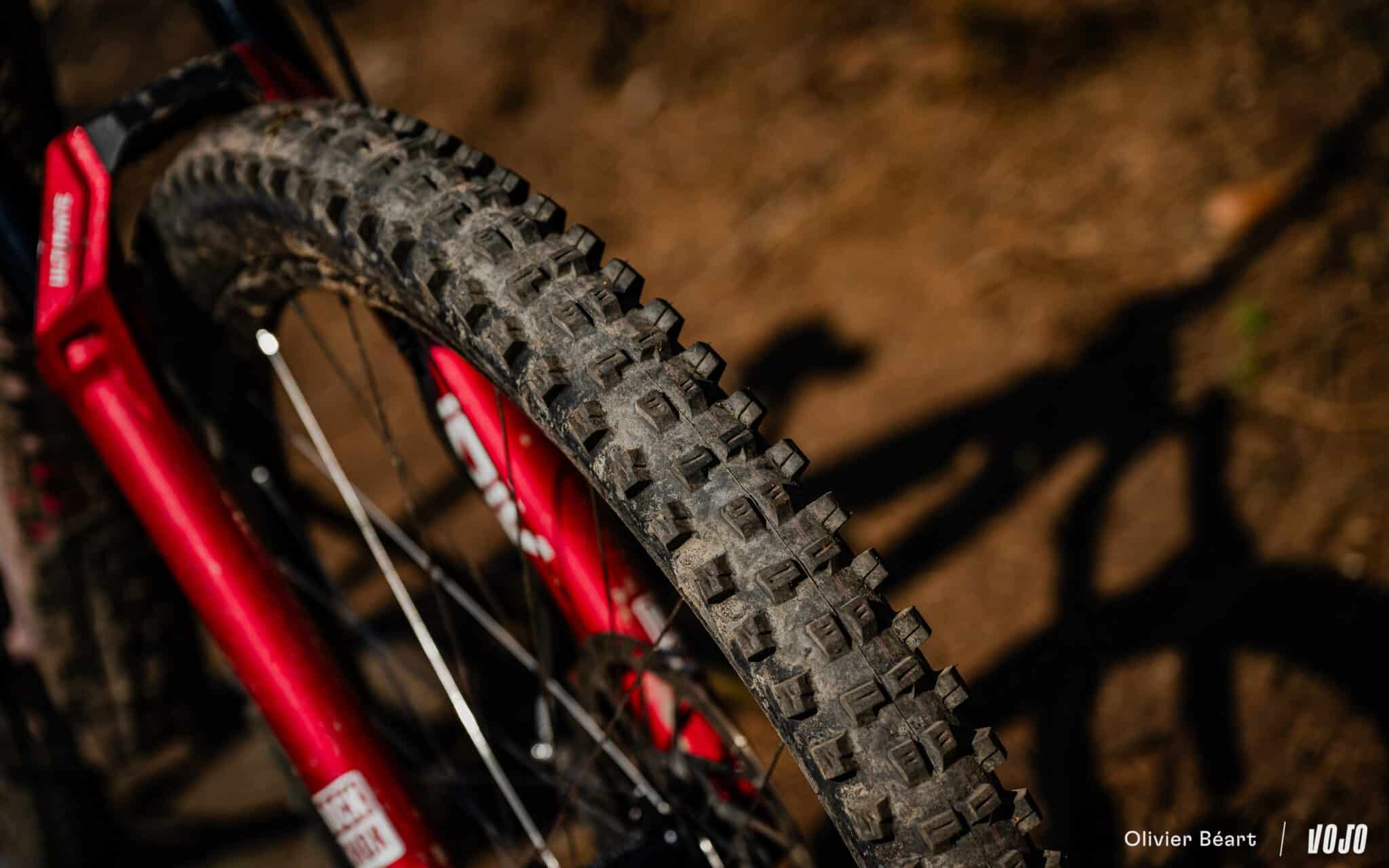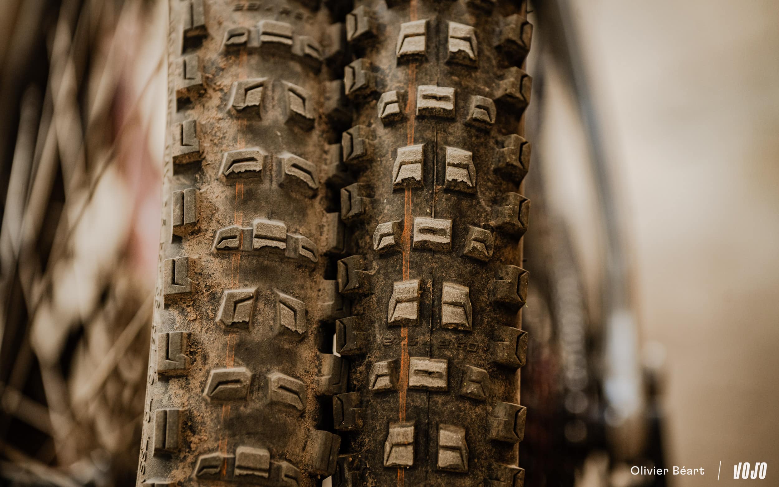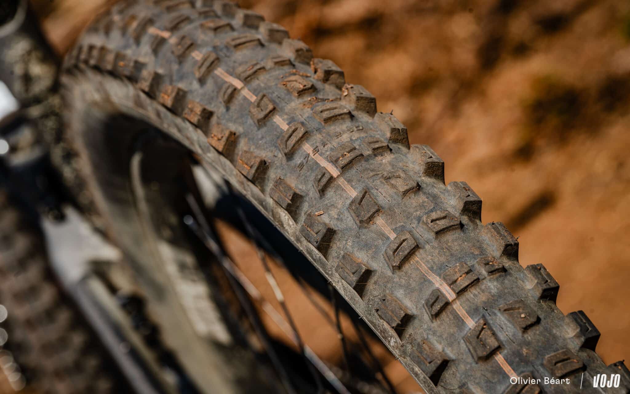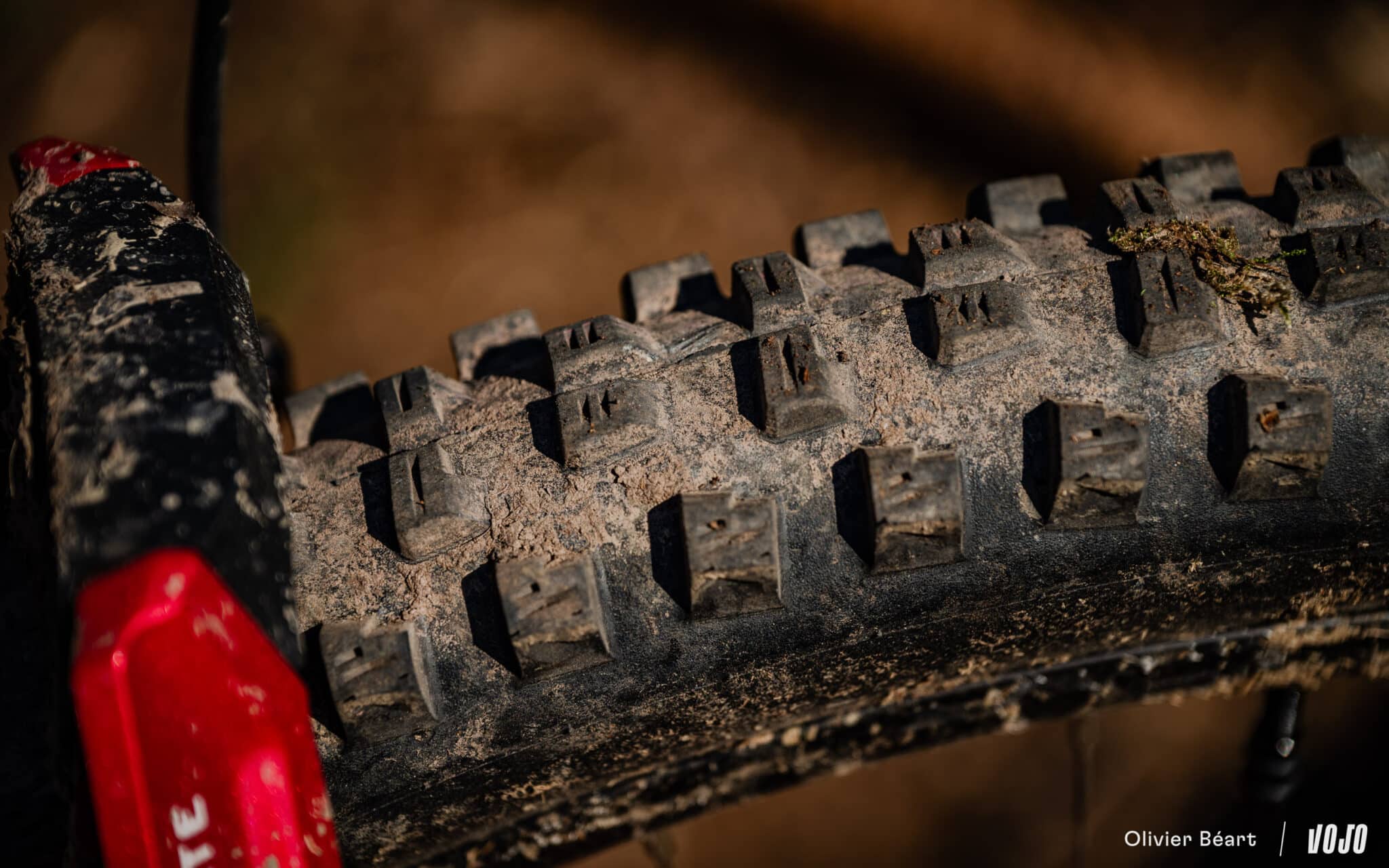 Au niveau de la solidité, Schwalbe semble clairement avoir fait fort aussi. Lors de la présentation, aucune crevaison à déplorer sur un groupe de 20 personnes et deux journées de tests intensifs. Par la suite, nous n’avons pas non plus eu le moindre souci sur nos terrains habituels, y compris en conditions de course où on commet souvent plus de petites erreurs car on recherche à atteindre ses limites. Les flancs des pneus n’ont aucune entaille, et les crampons tiennent encore tous bien, que ce soit en carcasse Gravity ou Trail. Cette dernière apparaît d’ailleurs comme bien assez solide pour la plupart des usages, hors course DH/Enduro très engagé ou pour des pilotes qui roulent sur des terrains habituellement assassins pour les pneus. Quant à l’usure, elle apparaît comme raisonnable. On peut voir quelques marques dues au freinage sur les crampons du Romy que nous avons beaucoup utilisé en montage arrière mais, après 350 km vraiment exigeants avec ce seul pneu, on se dit qu’il pourra encore en faire au moins 3 ou 4 fois plus, ce qui le place dans la bonne moyenne pour ce type de pneus hautes performances, même si certains comme Continental font encore mieux.