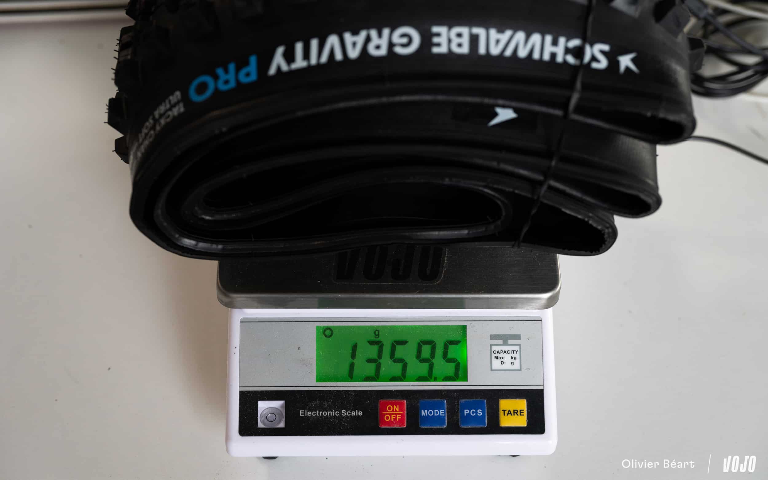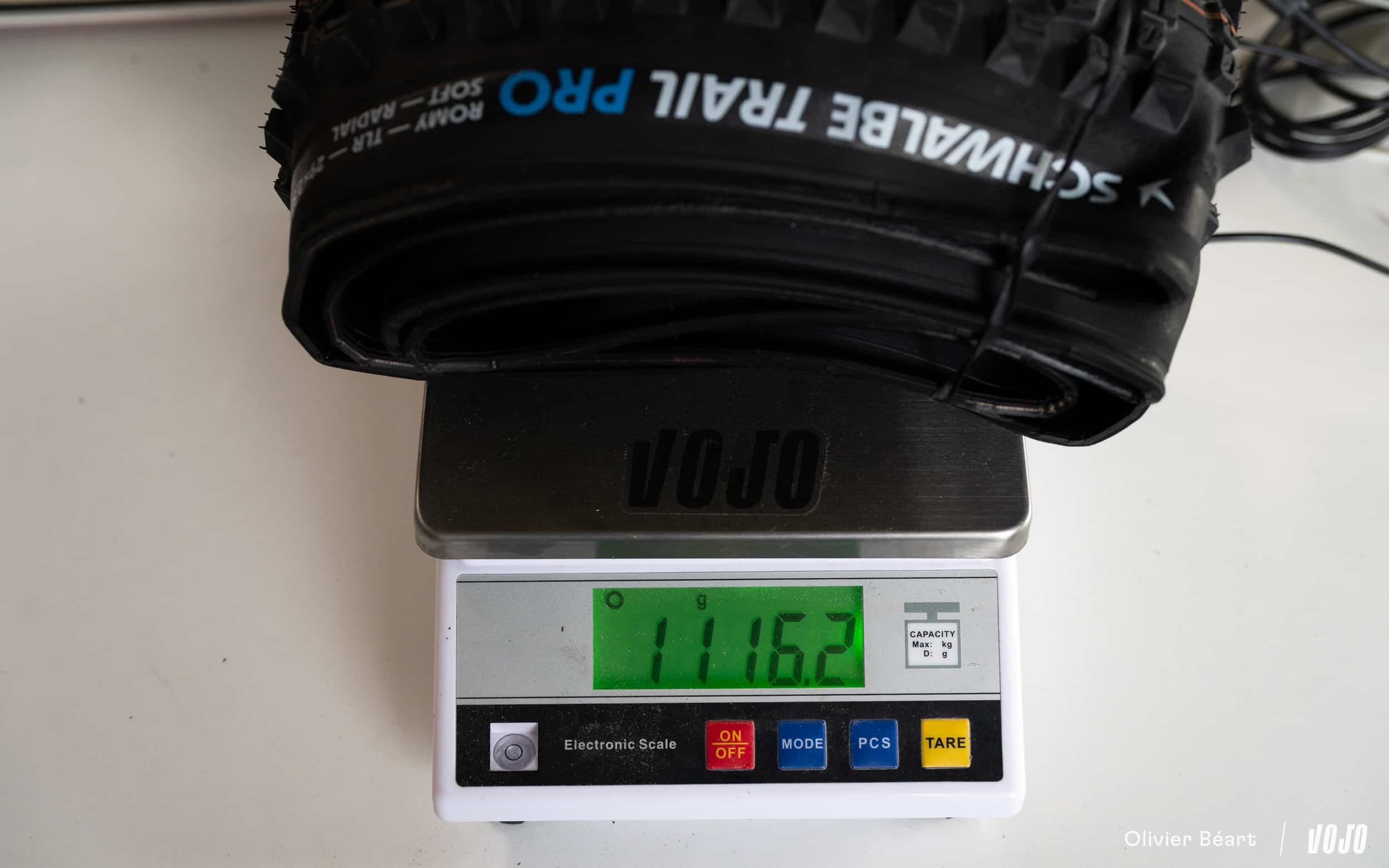 Sur notre balance, nous avons pesé notre Schwalbe Romy 29×2.5 en carcasse Trail Radial et gomme Soft à 1116 g. Ce qui n’en fait pas un poids plume, loin de là, mais on est sur une des versions les plus lourdes de la gamme, et Schwalbe a préféré jouer la carte de la solidité et du comportement, plutôt que celle de la chasse aux grammes. Soulignons que c’est un peu en dessous du poids annoncé par la marque, ce qui tend à montrer qu’on peut croire ce qui est écrit dans le tableau présenté plus haut.
