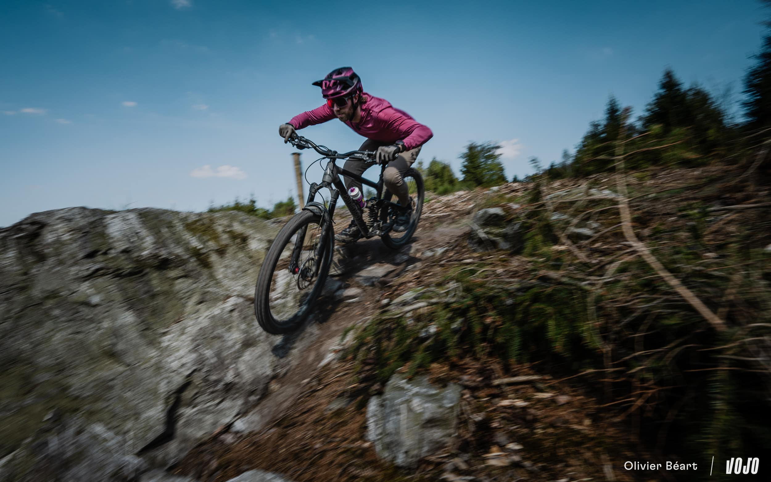 En montage avant, le Romy nous a moins convaincus. Il faut vraiment prendre de l’angle pour bien activer ses crampons latéraux et on peut sentir un petit flou au moment de la transition avec la bande centrale. Le freinage reste bon, et il est agréable sur les singletracks sinueux, mais dès qu’on engage un peu plus, il ne met pas autant en confiance que d’autres pneus de la gamme Schwalbe, comme le Magic Mary ou le Tacky Chan dont nous parlerons juste après. A l’avant, il rappelle qu’il s’agit d’un pneu de all-mountain destiné à des vélos de petit/moyen débattement, et on le réservera à cet usage en montage avant, alors qu’il peut clairement voir plus large en montage arrière.