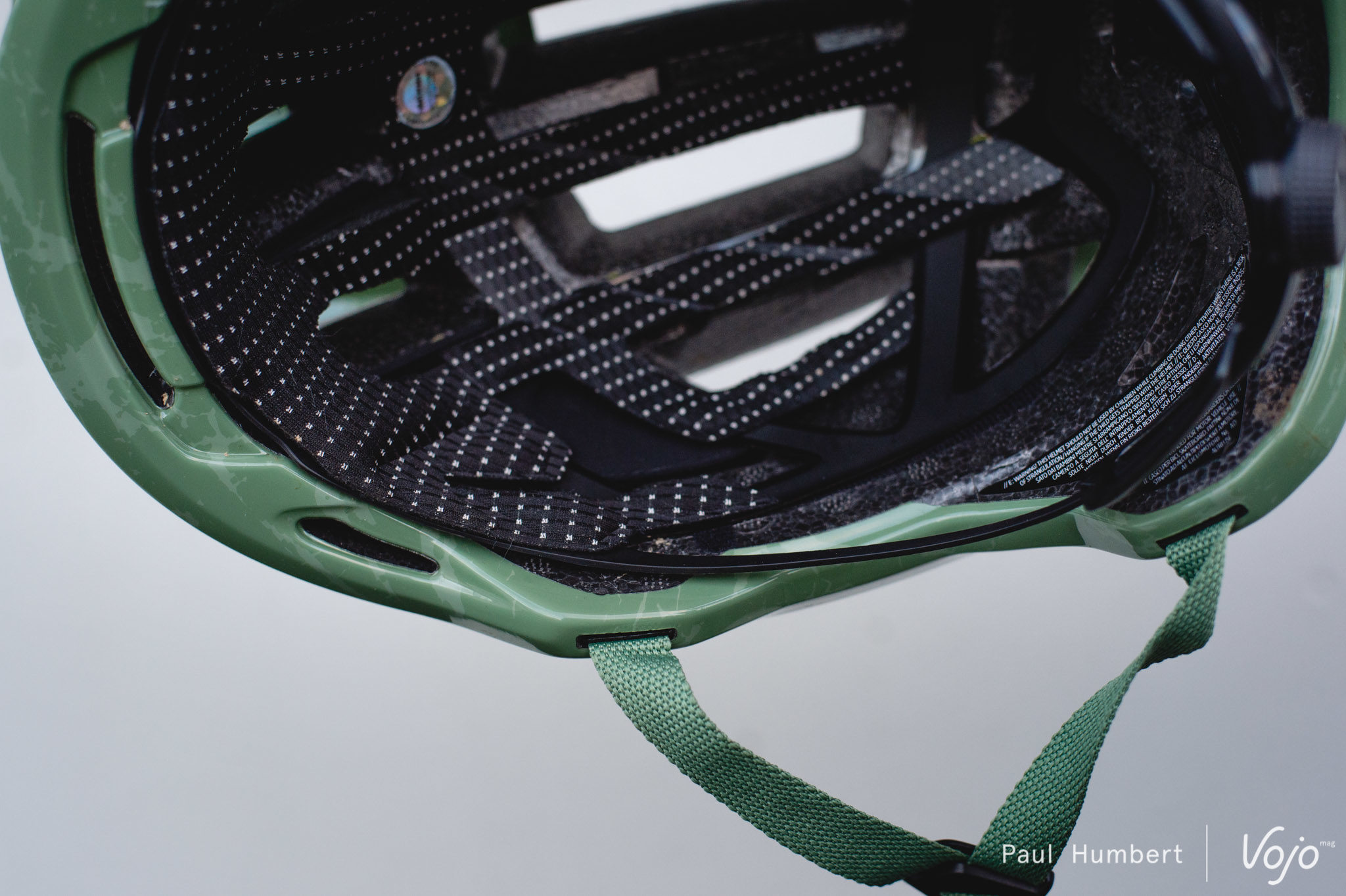 A l’intérieur, l’habituelle structure en mousse EPS est complétée par deux empiècements en polyuréthane (PU) au-dessus des tempes censés améliorer l’absorption des chocs de faible et moyenne intensité. Dans le même souci d’augmenter le niveau de protection, la forme est plus couvrante sur les côtés et l’arrière de la tête que la plupart des casques de la marque.