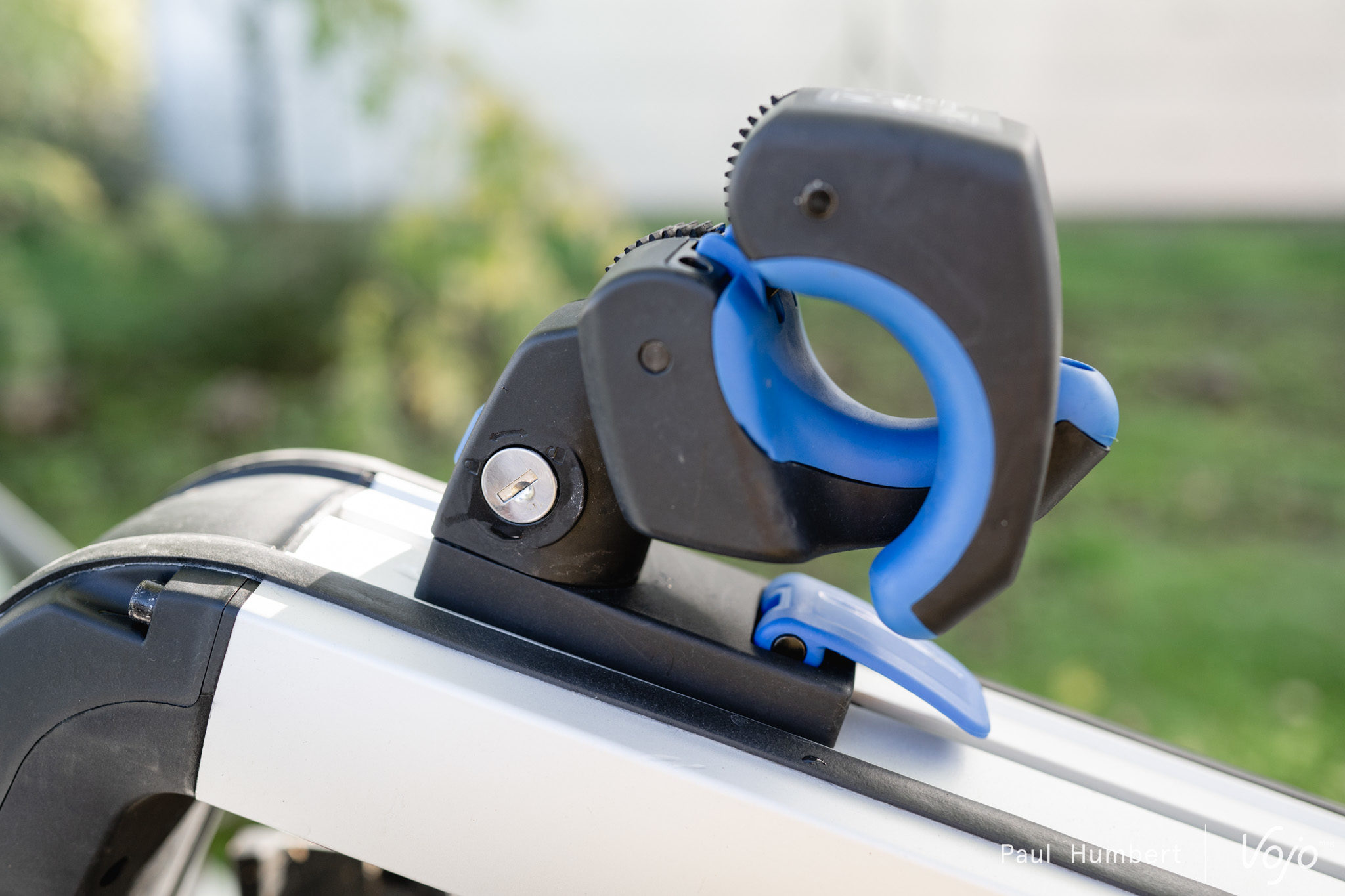 Ce qui peut coincer, c’est justement ce grand bras en aluminium. Du fait de cette conception, la pince qui maintient chaque vélo ne peut que coulisser verticalement, elle ne peut pas se déplacer horizontalement. Or, sur certains e-bikes notamment, on ne peut pas serrer au niveau du tube supérieur à cause de l’ancrage d’amortisseur et on ne peut pas non plus prendre le tube diagonal à cause de la batterie, le diamètre est trop important pour la taille de la pince. Même problème pour les vélos de ville sans tube supérieur. Décaler la pince de quelques centimètres suffirait à régler le problème mais ce n’est pas possible. Ainsi, nous n’avons pas pu installer le dernier Focus Jam² SL (lire Test nouveauté | Focus Jam² SL : le trait d’union) sur ce porte-vélo.