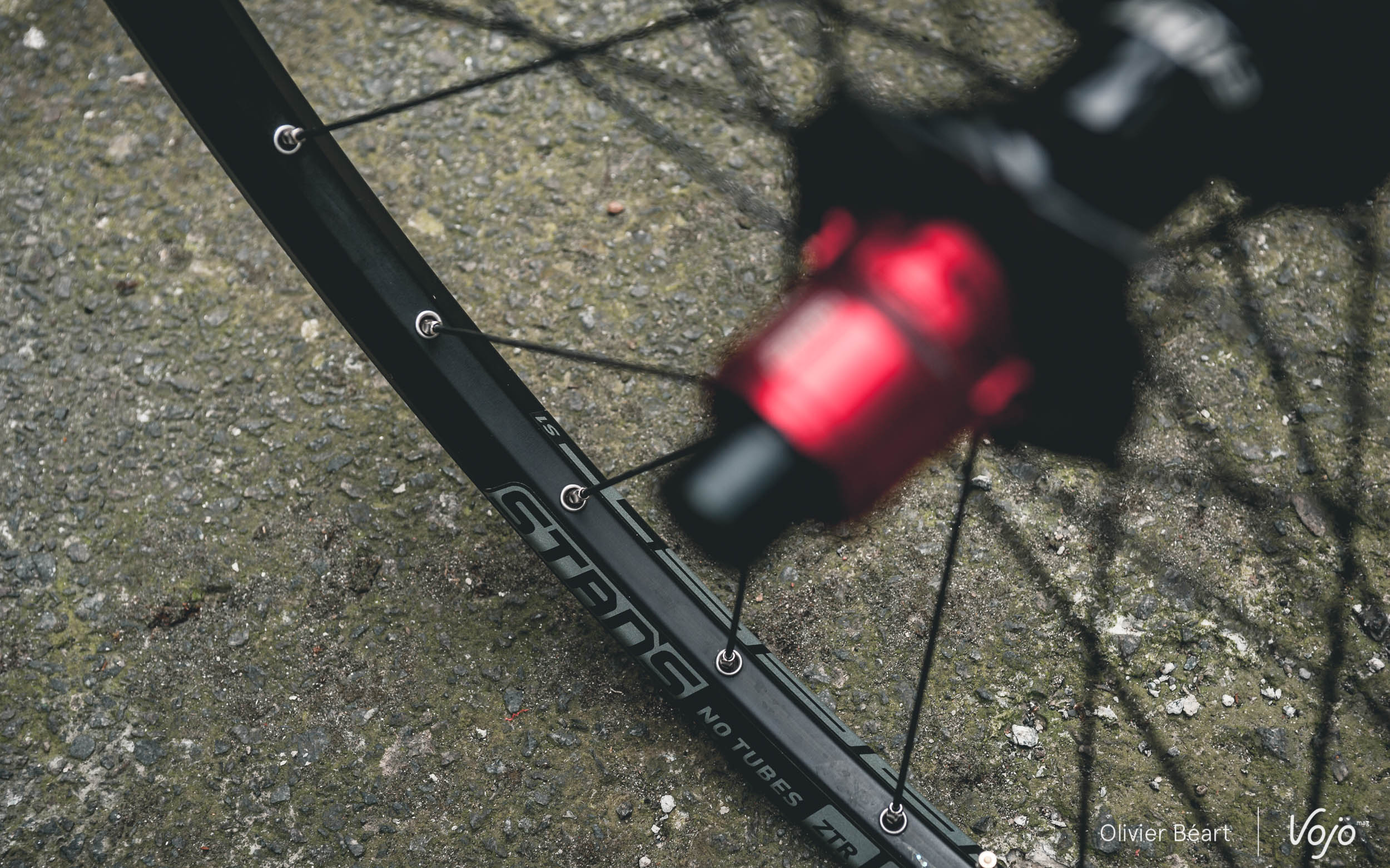 Le rayonnage est on ne peut plus classique aussi, avec 32 rayons Sapim Race Black à l’avant comme à l’arrière (on est sur 28 rayons à l’avant sur les roues Mk3 complètes proposées par NoTubes). Au final, on se retrouve avec une paire de roues à 1831g, soit loin d’un record, mais nous allons voir dans le test qu’elles ont tout de même des qualités qui permettent de sentir une amélioration. Côté tarif, on l’a dit, il est de 499€ la paire, mais en cherchant un peu, il est possible de faire de bonnes affaires sous les 400€. Pour mémoire, une paire de Mk3 vaut 699€.