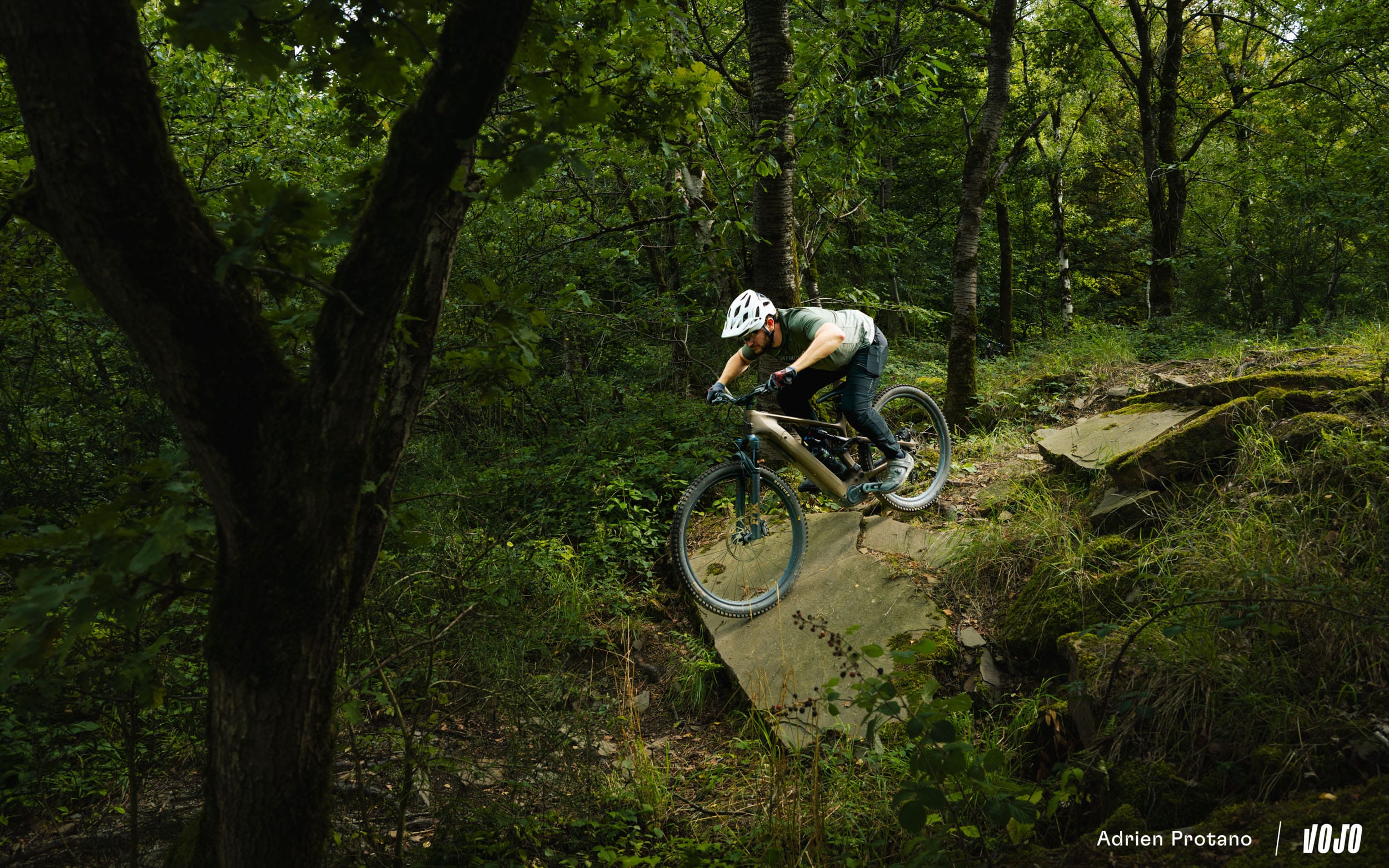 Le Levo propose toujours plusieurs possibilités de personnalisation, car tout le monde n’a pas les mêmes attentes et ne roule pas sur les mêmes terrains. Des coupelles au niveau du jeu de direction permettent de faire varier l’angle de direction de +/- 1°, l’ancrage de l’amortisseur va permettre de faire varier la hauteur du boîtier de pédalier de +/- 6mm et un excentrique au niveau du point de pivot arrière permet de faire varier la longueur des bases de +/- 9mm. Au final, cela fait beaucoup de réglages et, même si nous vous encourageons à essayer, il est facile de s’y perdre. Nous avons pour notre part roulé avec l’angle de direction neutre et les bases courtes, et nous avons juste changé un peu plus régulièrement la hauteur du boîtier en optant pour la position basse pour les sorties plus engagées et la haute pour les sorties mixtes avec davantage de pédalage.