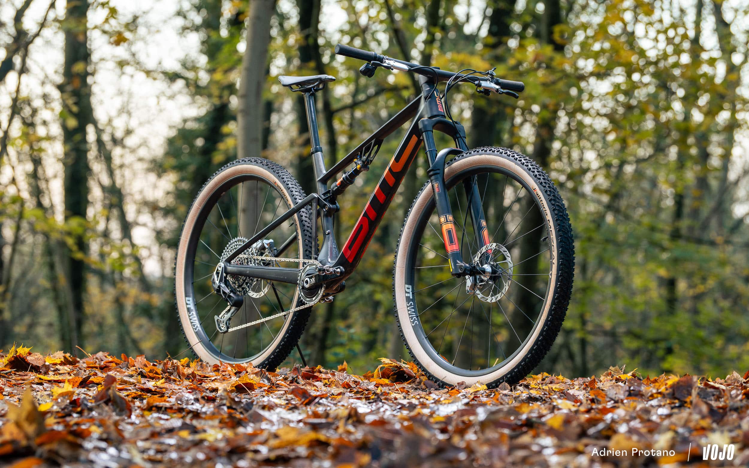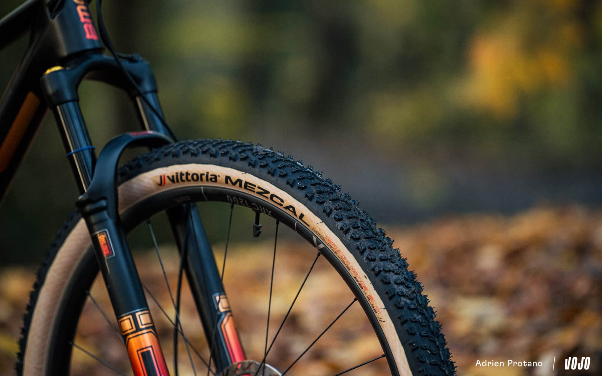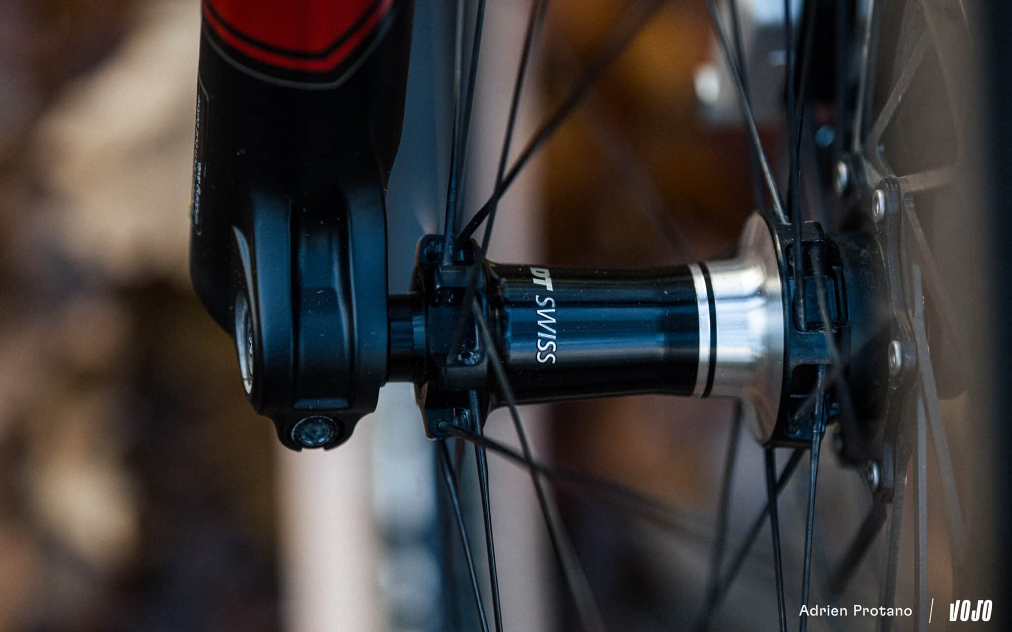 Le train roulant est estampillé DT Swiss, avec une paire de jolies XRC 1200 de 30 mm de largeur interne et annoncée à 1303 g. Le casting est par contre plus brouillon du côté des pneumatiques où l’on a des Vittoria Mezcal en 2.35″ de section. Une paire de pneus qui s’est avérée rapidement dépassée dans les conditions hivernales de ce test (et plus personnel, pas le meilleur choix esthétique avec leurs flancs beiges). Vous remarquerez qu’on leur a troqué un duo de chez Continental, à savoir le Dubnital/Magnotal pour affronter la boue.