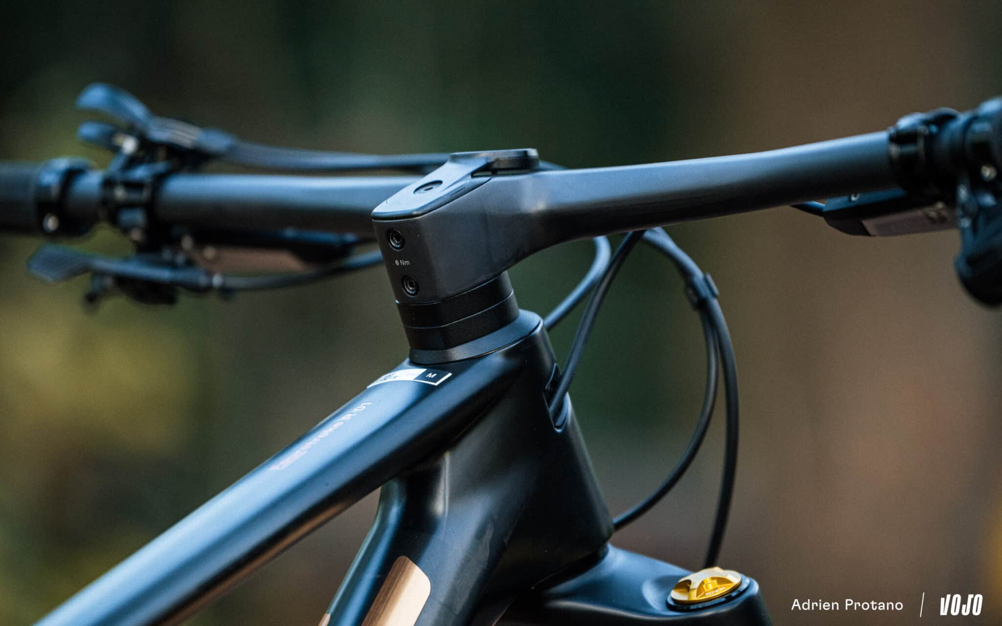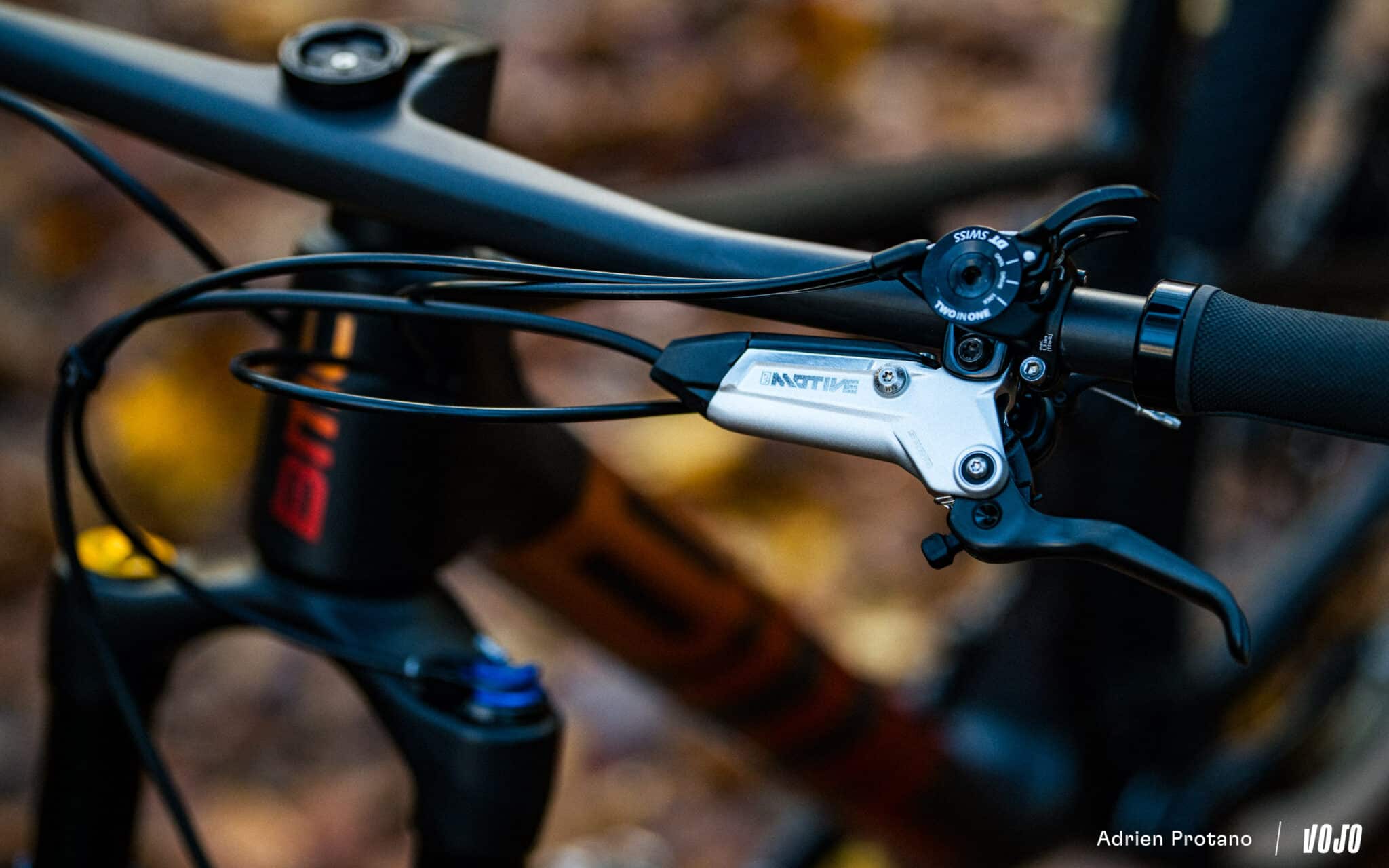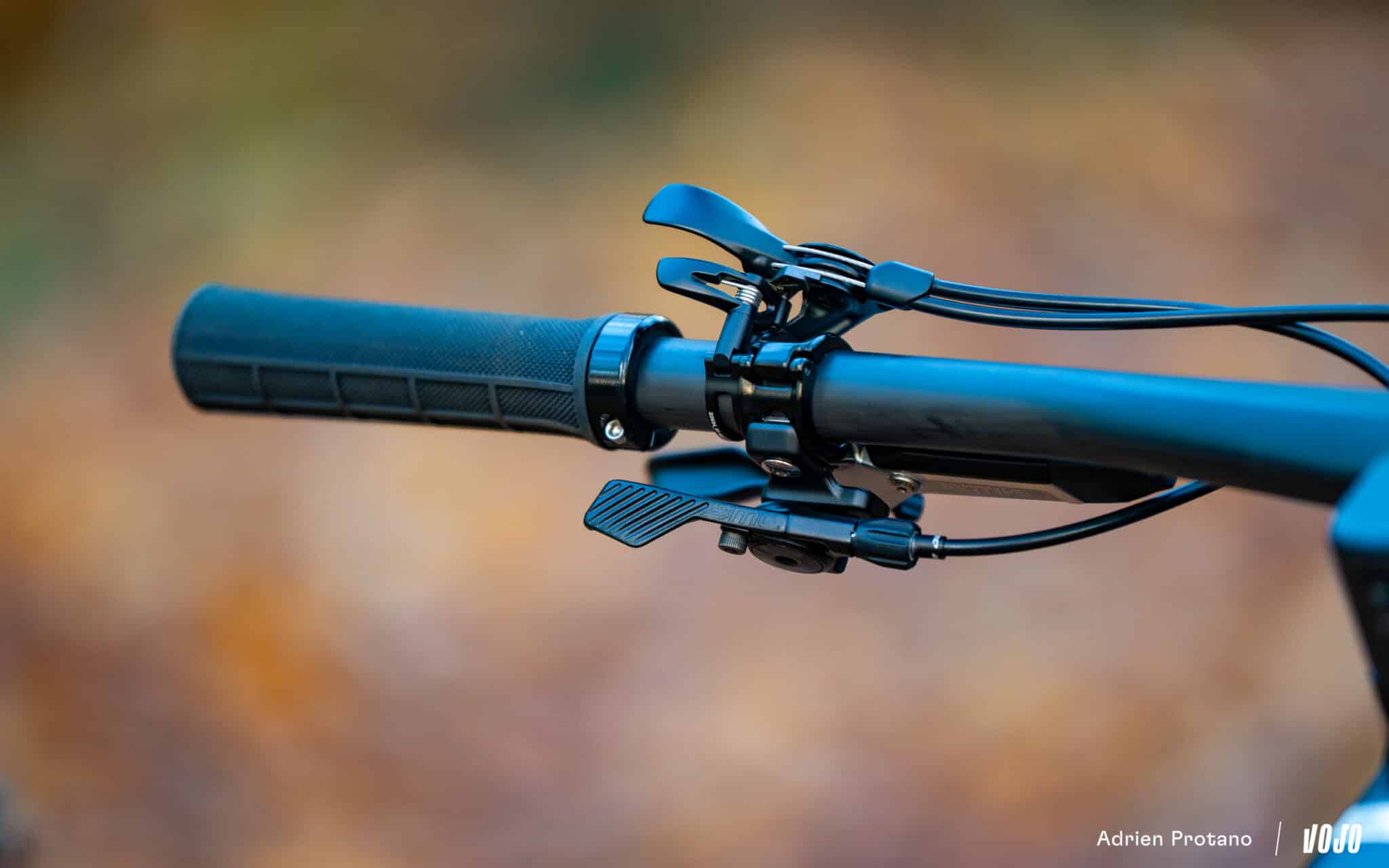 Le système de commande à trois positions mérite qu’on s’y attarde. C’est très personnel : certains apprécieront de pouvoir définir une position “ouverte” réellement optimisée pour la descente, sans compromis sur le pédalage, puis de basculer sur des modes intermédiaire ou bloqué selon le terrain. D’autres préféreront sans doute la simplicité d’un blocage à deux positions. Ici, l’intérêt majeur réside justement dans cette position ouverte pleinement exploitée, les deux autres venant adapter le vélo aux phases de pédalage ou aux sections roulantes. En revanche, la commande au guidon n’est pas parfaite : il faut déplacer légèrement la main pour passer du blocage à la tige de selle, ce qui fonctionne, mais manque un peu d’ergonomie sur les longues sorties. On se surprend à rêver d’une intégration plus intuitive.