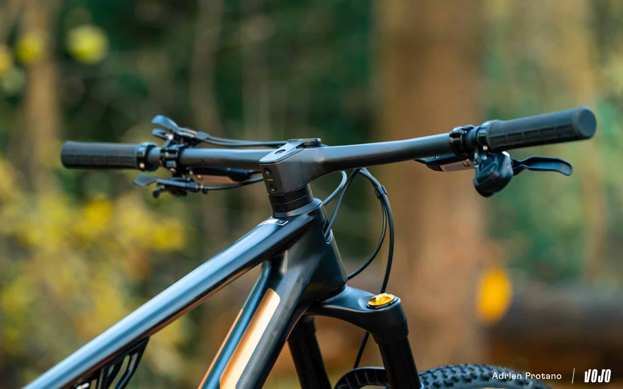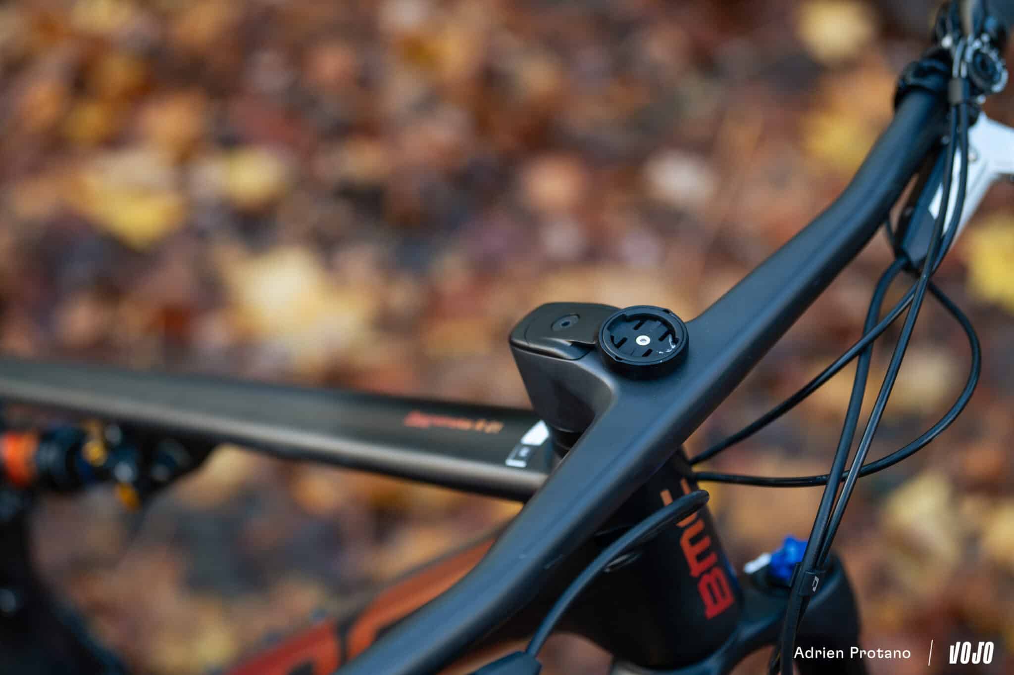 On a déjà parlé de la tige de selle télescopique maison et intégrée, c’est la même logique du côté du poste de pilotage avec cette solution en une pièce en carbone de chez BMC. Celui-ci offre une largeur de 760 mm, un backsweep de 8° et une potence de -19°. On notera le petit support pour GPS (fixation type Garmin) intégré de série.