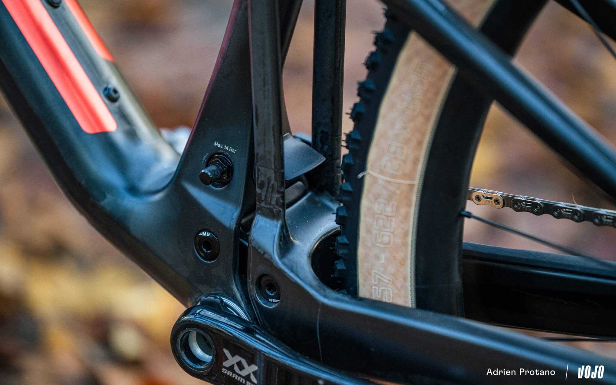 Enfin, le boîtier de pédalier bas mérite d’être mentionné. Il participe grandement à la stabilité et au feeling de pilotage, mais peut aussi devenir pénalisant dans certaines situations, notamment sur des franchissements ou des sections très trialisantes où il faudra redoubler d’attention.