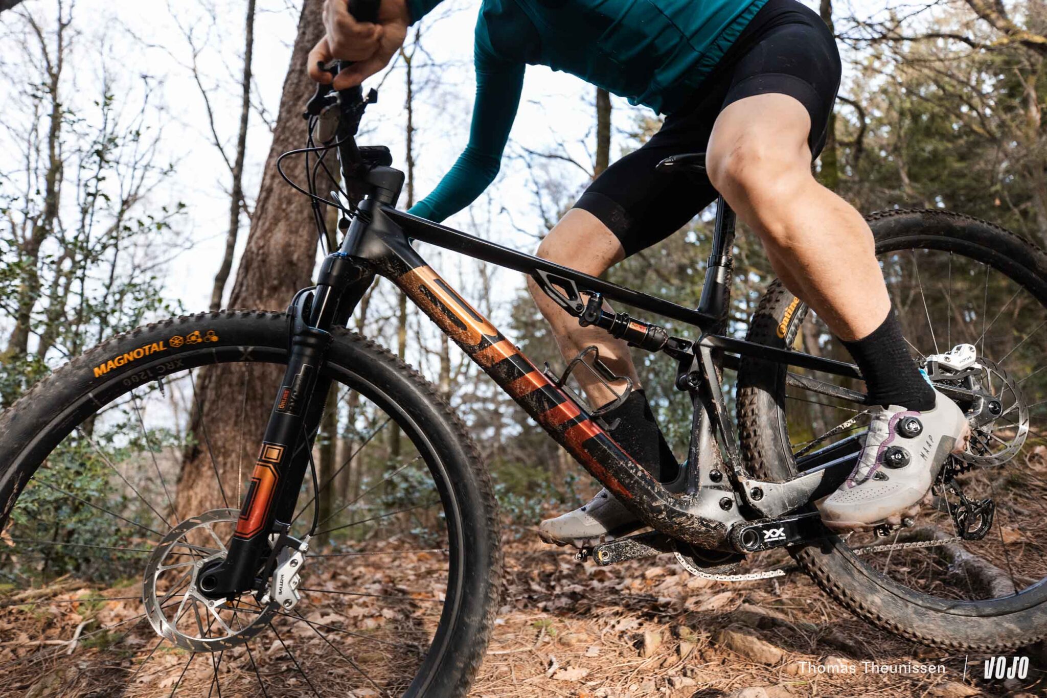 Sur les longues montées sur piste, on joue volontiers entre les modes bloqué et intermédiaire : blocage total sur les sections régulières, mode intermédiaire dès que le terrain se dégrade, afin de conserver de la nervosité tout en laissant travailler la suspension. Si l’on cherche la réactivité la plus sèche possible, le Fourstroke n’est pas un pur “missile” façon Epic World Cup ou Supercaliber. En revanche, il offre une rigidité largement suffisante pour du XC, avec un surplus de grip et de confort qui fait la différence dès que le terrain devient exigeant.