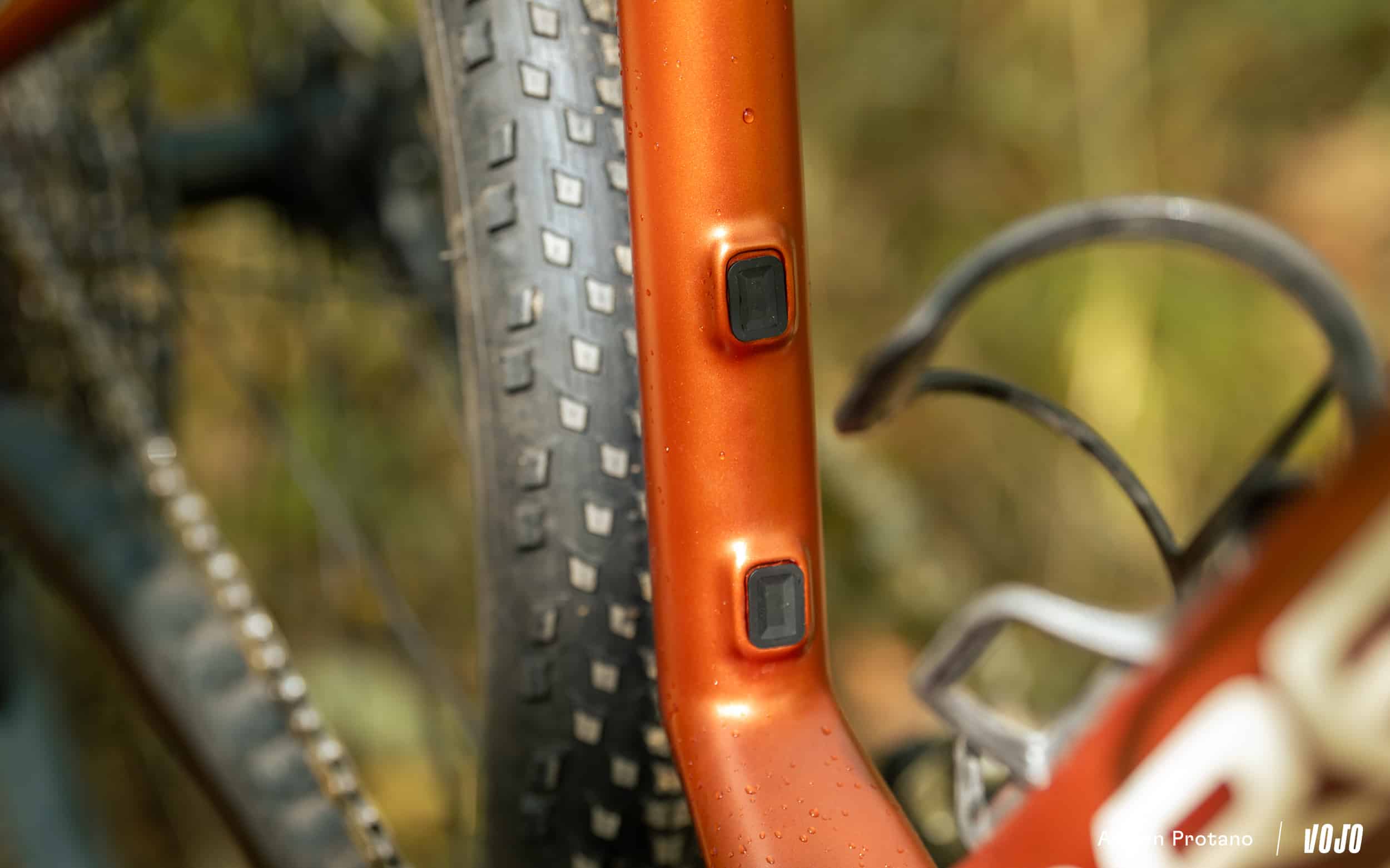 Les traditionnels inserts filetés laissent désormais place à deux ouvertures rectangulaires. Elles peuvent être simplement obturées pour permettre une insertion maximale de la tige de selle télescopique. Mais Orbea va plus loin : il est possible d’y insérer deux petits blocs filetés qui offrent un second emplacement de porte-bidon. Selon le modèle de porte-bidon choisi et la longueur des vis, il sera même possible de cumuler une tige de selle longue et un deuxième bidon.