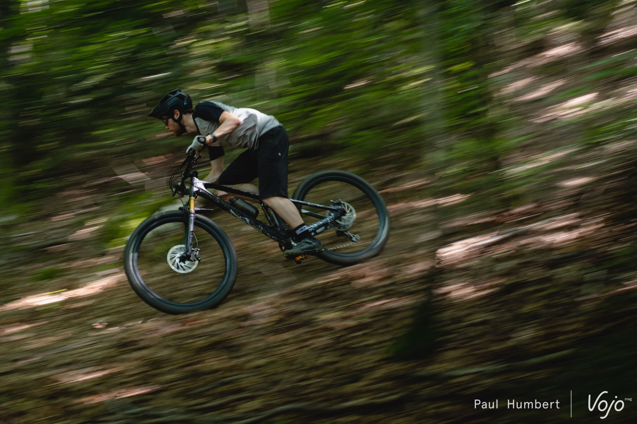 Reste que la position et la géométrie ne sont pas les seuls éléments à influencer le comportement du vélo, les caractéristiques intrinsèques du cadre et les suspensions jouent aussi un rôle. Sur ces dernières, on sent clairement qu’YT a misé sur le confort. Avec un sag de 25 % à l’arrière et des pneus gonflés à 1,4 bar, l’Izzo est un véritable tapis volant, effaçant toutes les petites imperfections du terrain. A l’avant, la fourche paraît un peu plus ferme et décalée vis-à-vis du confort de l’arrière.