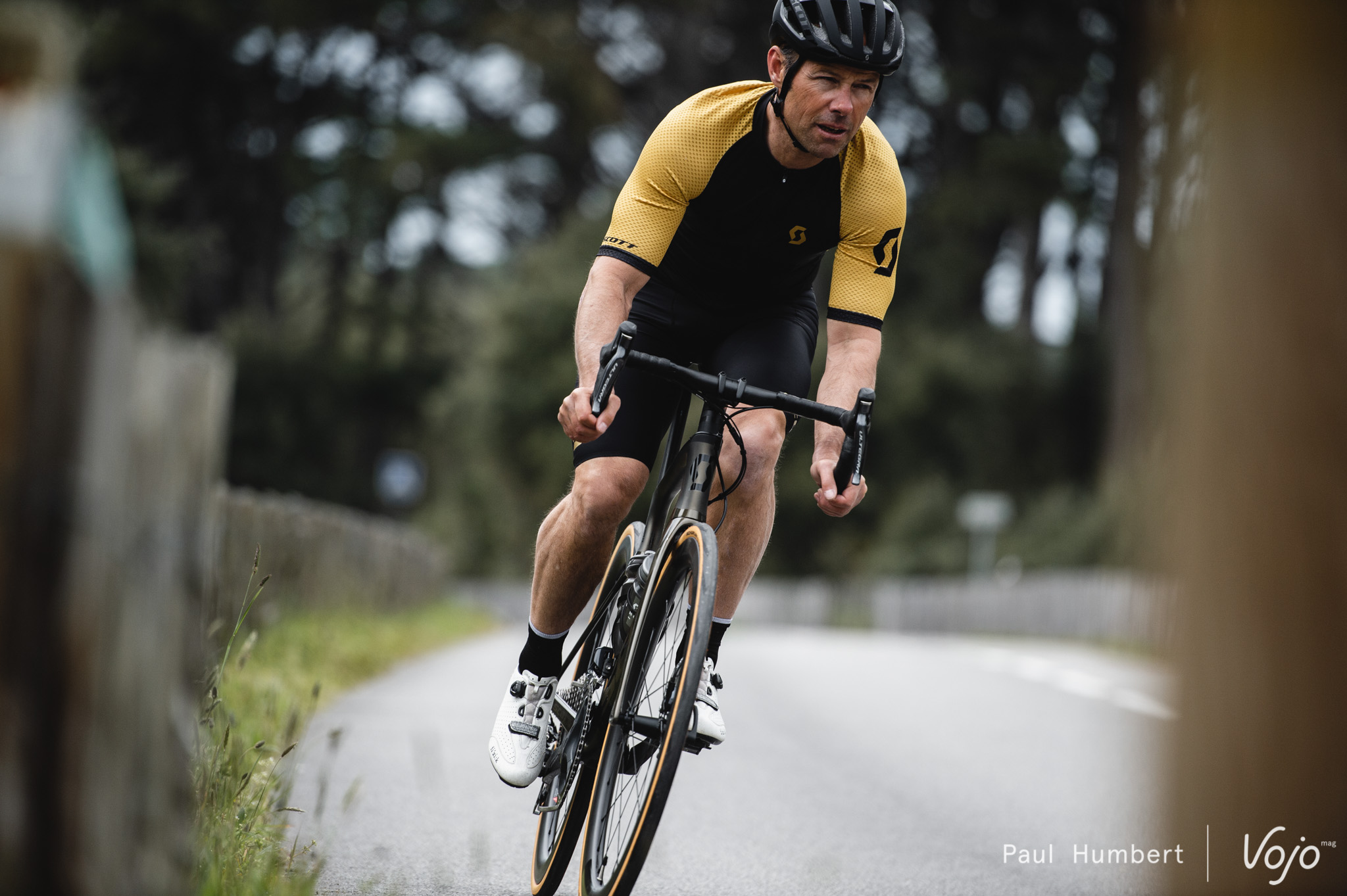 Traverser les océans le plus vite possible, voler sur l’eau et dompter un géant des mers, c’est ce qui anime Thomas Coville. Le skipper français, qui fait partie de la classe très fermée des « Ultimes », ces trimarans géants, est également un passionné de vélo. Il roule sur la route et en VTT autour de son port d’attache, La Trinité-sur-Mer, et partage certaines de ses sorties avec d’autres membres de son équipe. En constante évolution, il est équipé de 120 capteurs de contrôle en temps réel et il « vole » sur l’eau grâce à ses foils, ces ailerons incurvés qui permettent au bateau de déjauger. Pas de surprise quand Thomas nous raconte, en parlant du vélo, « être passionné par l’objet ». Les analogies avec le vélo sont nombreuses pour lui, et Thomas retrouve sur ces machines un rapport particulier au temps, à la douleur, et à l’adaptation même aux machines. À VTT, ce qu’il aime, c’est se mettre dans le rouge, ne pas poser pied à terre et apprécier les descentes ludiques. Il n’accepte pas ses limites et il le sait, et c’est d’ailleurs ce qui anime ses réflexions en pleine mer ou sur un vélo de route. Il se questionne, interroge ses émotions, sans parfois trouver de réponse : « Il y a des choses qu’on n’arrive pas à expliquer. La solitude, la lumière, le son d’une vague. Personne à terre ne peut le comprendre. » Il aime toutefois s’entourer de personnes qui l’inspirent, des passionnés, et il se nourrit de discussions avec le comédien Jacques Gamblin, qui met en scène certaines de leurs réflexions, ou avec le regretté philosophe Michel Serre.
