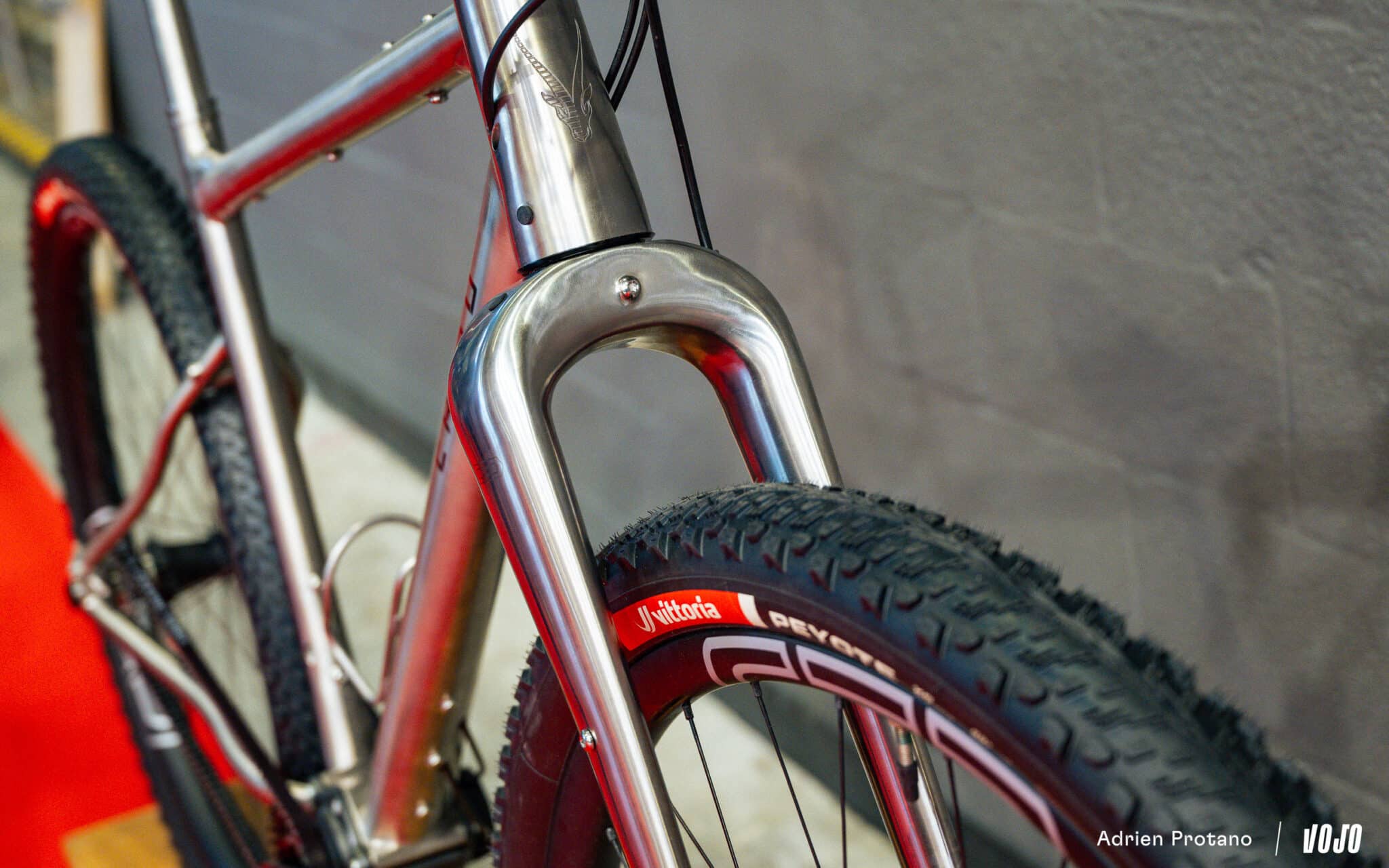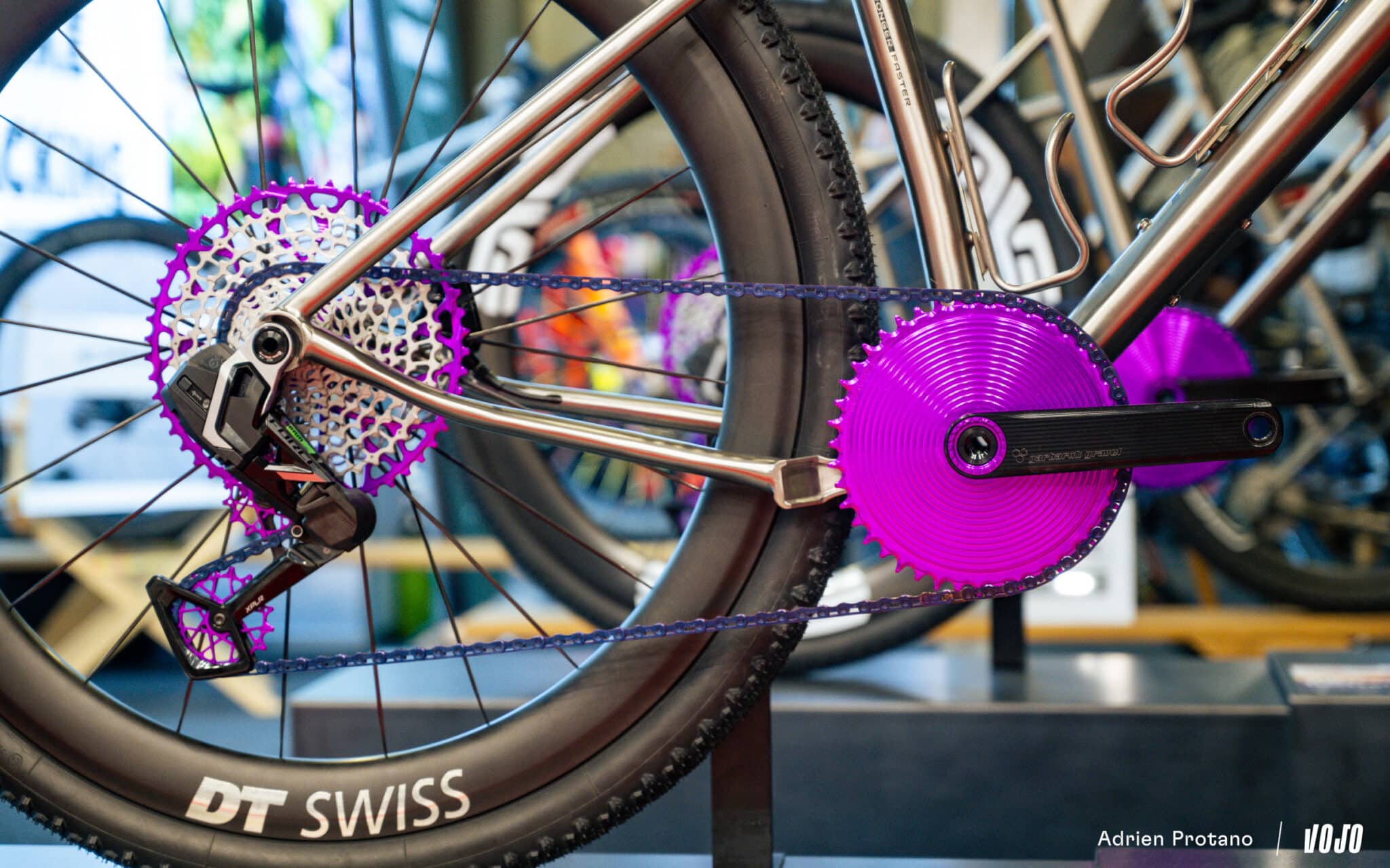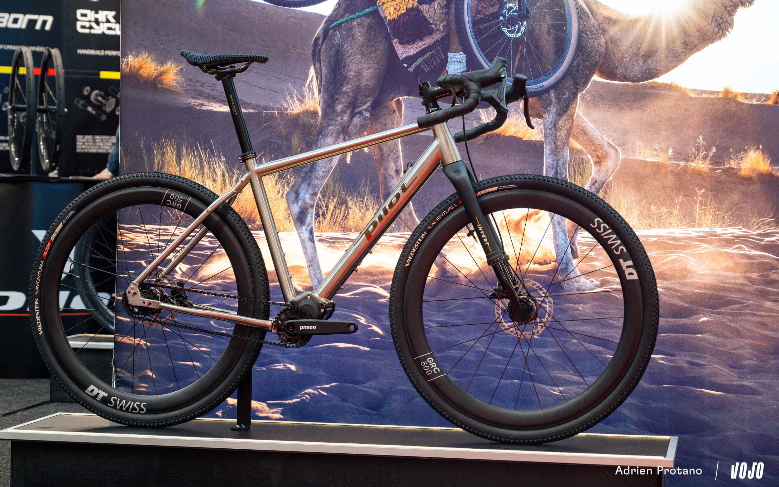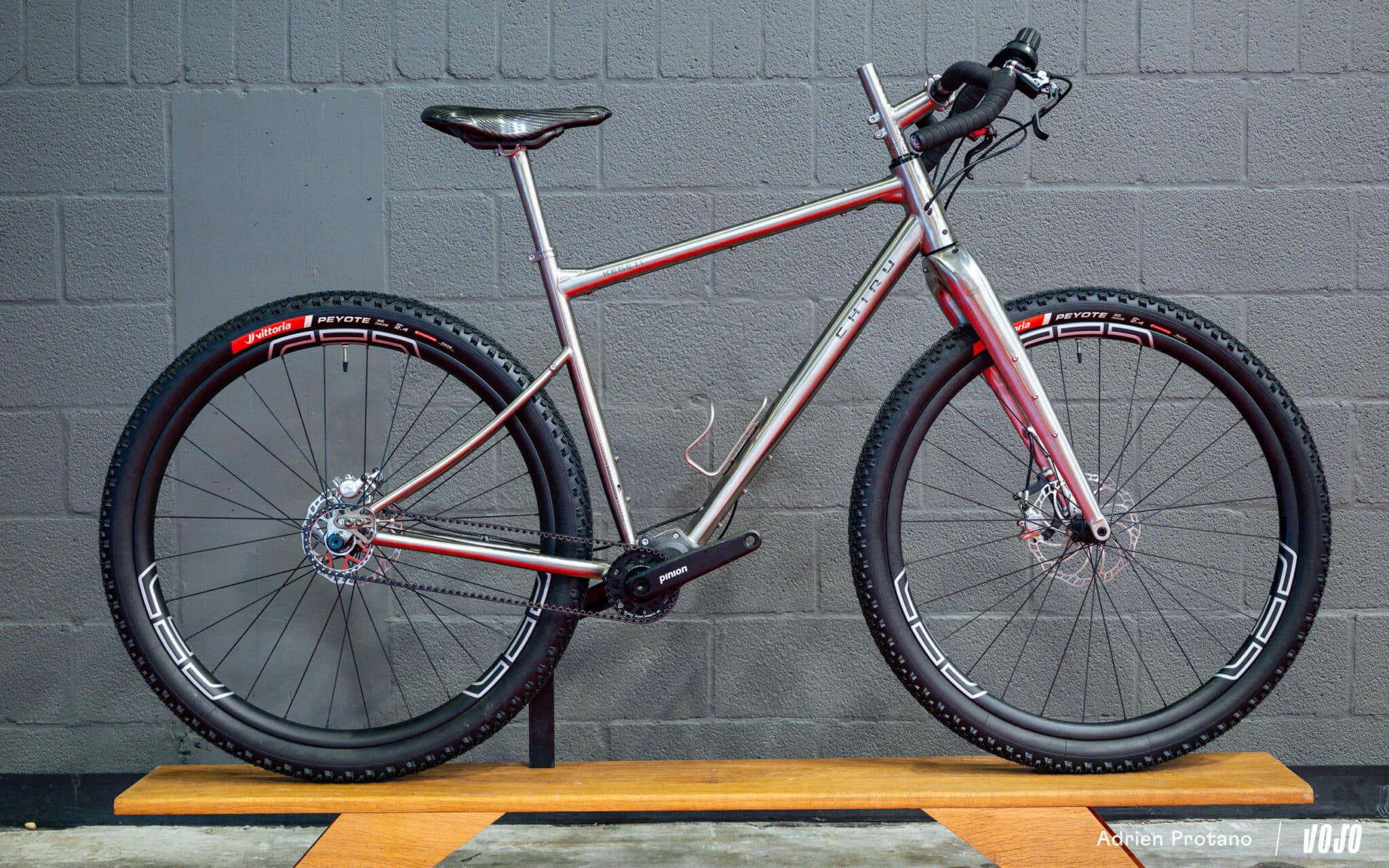 Chiru avait également un Kegeti dans ses valises, que la marque présente comme un gravel titane aux capacités de VTT. On notera le dégagement pour pneus allant jusqu’à du 2.4 et la boite de vitesses Pinion à courroie.