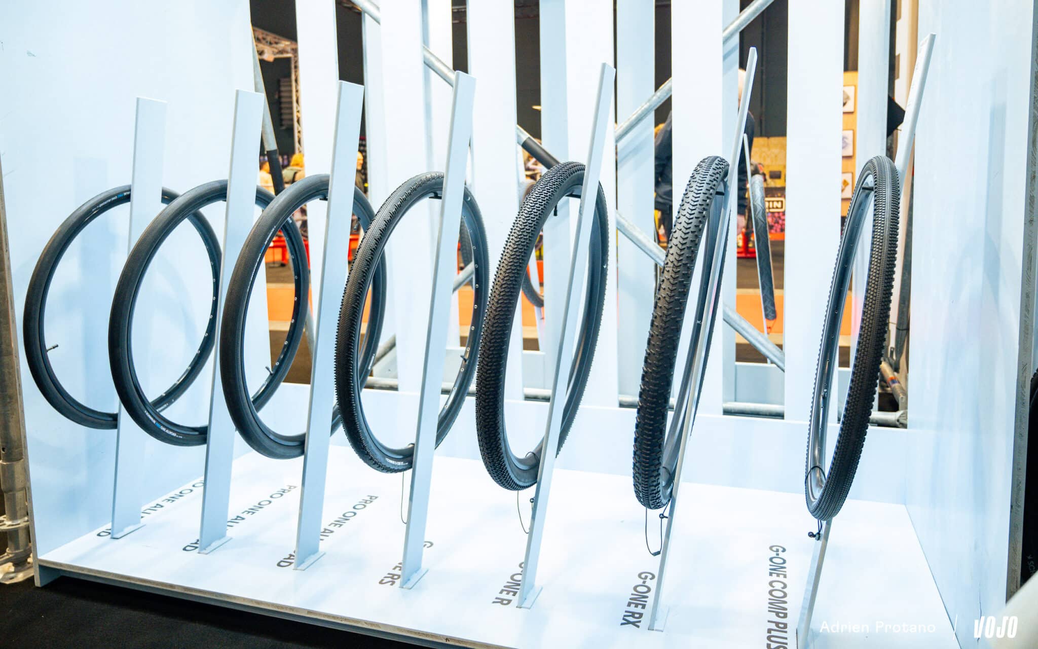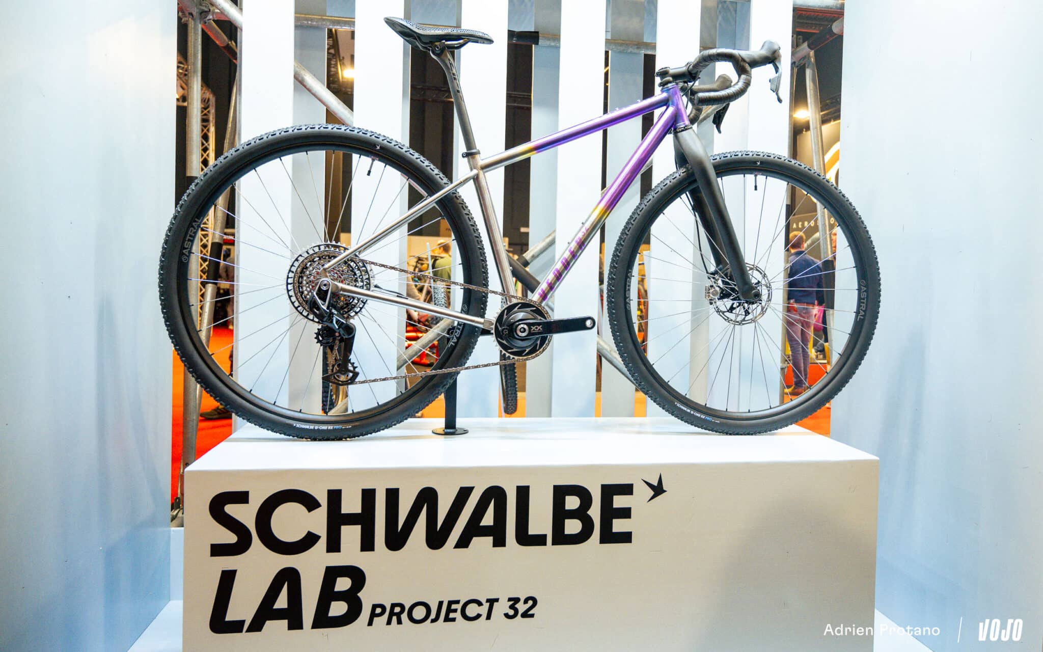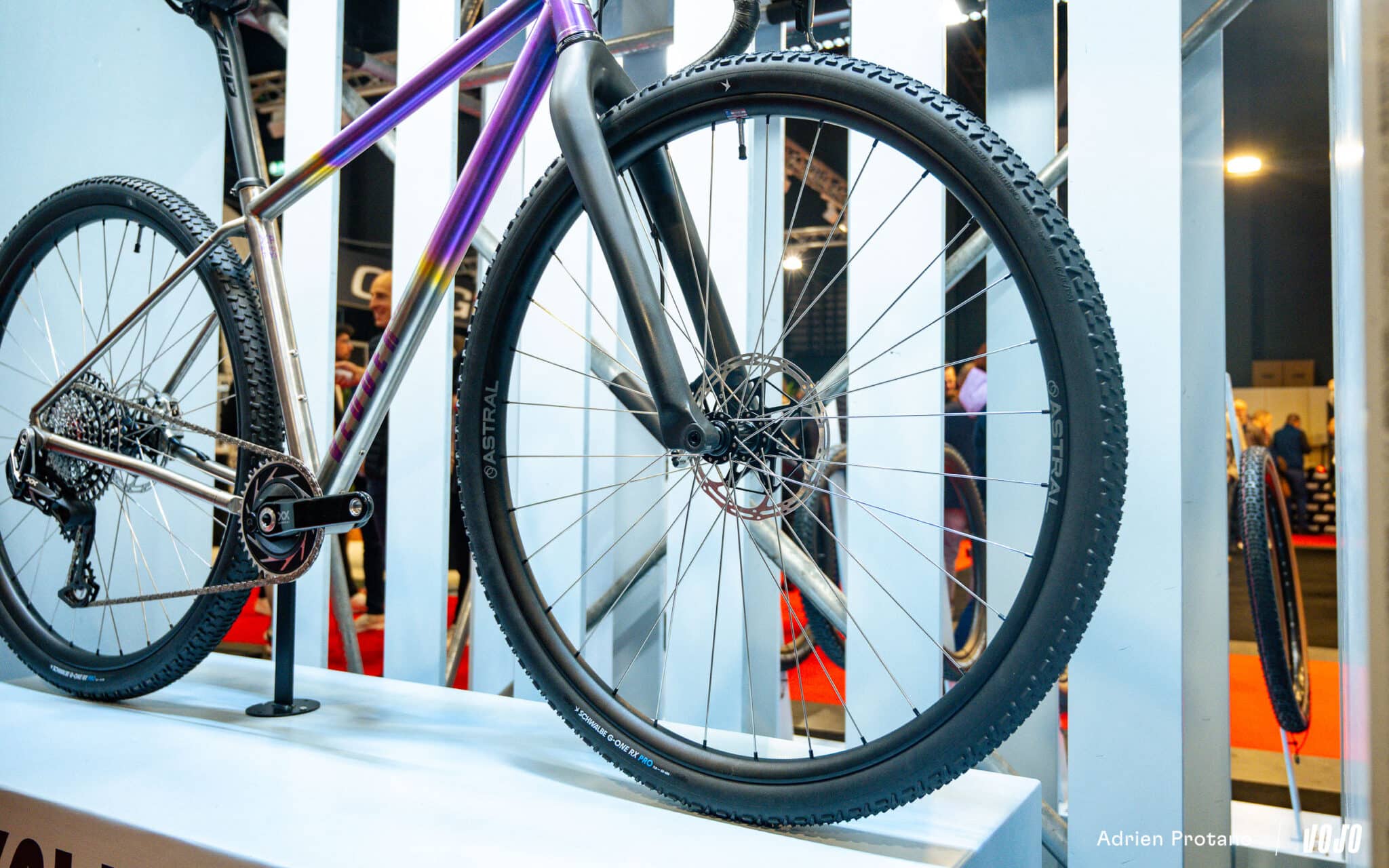 Le public a ainsi pu découvrir le premier prototype de pneu 32″ de la marque sur le stand Schwalbe, ici destiné au gravel avec une déclinaison du G-One RX Pro.