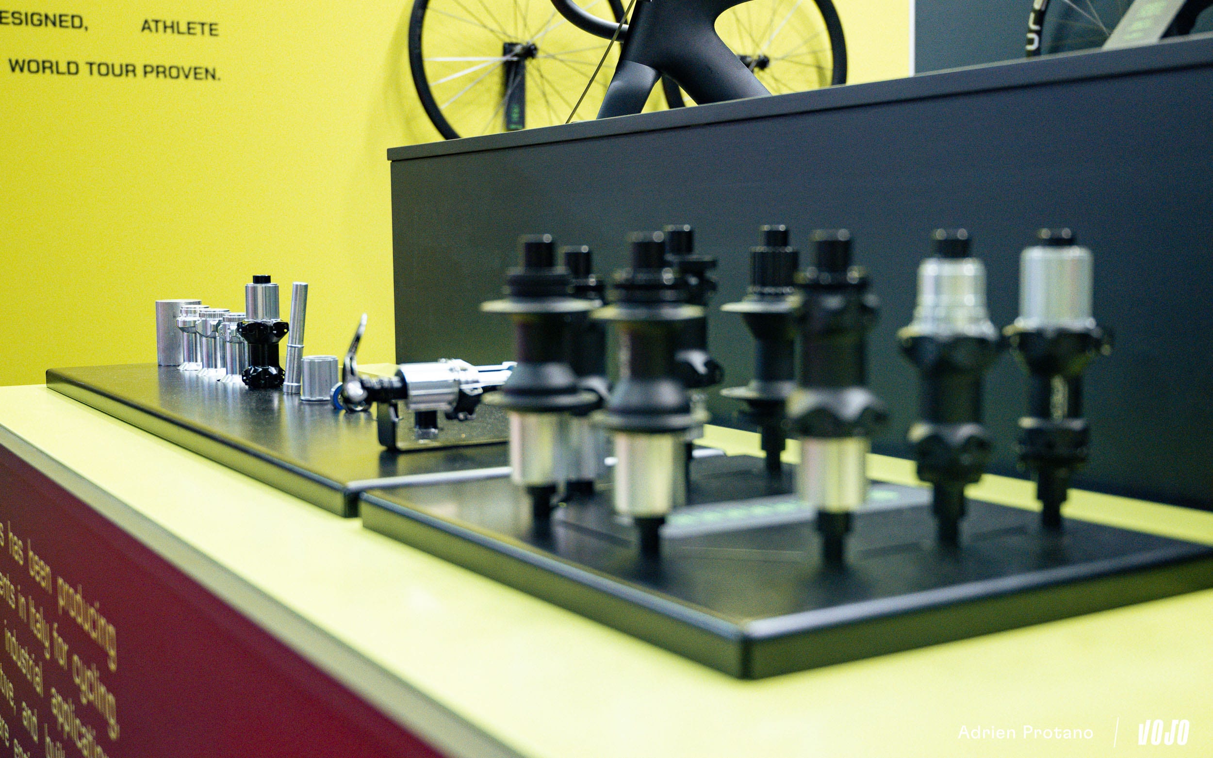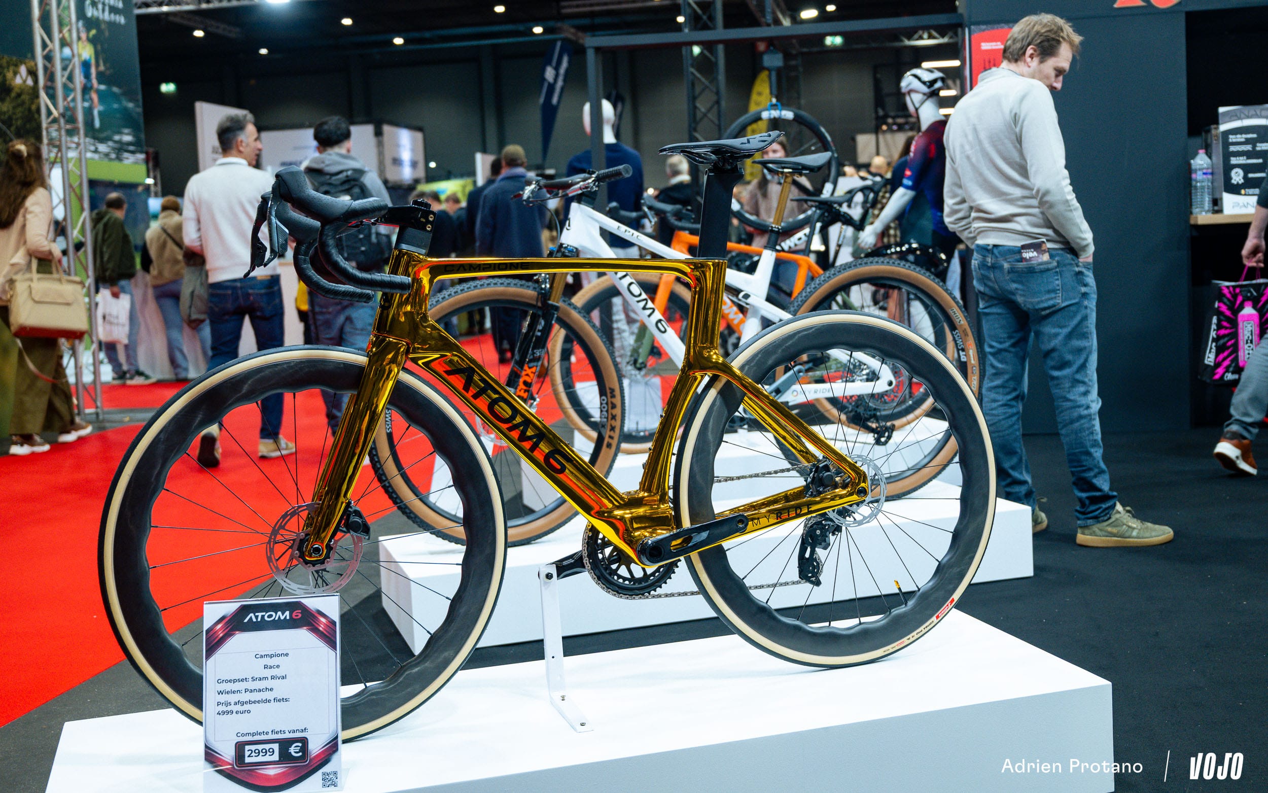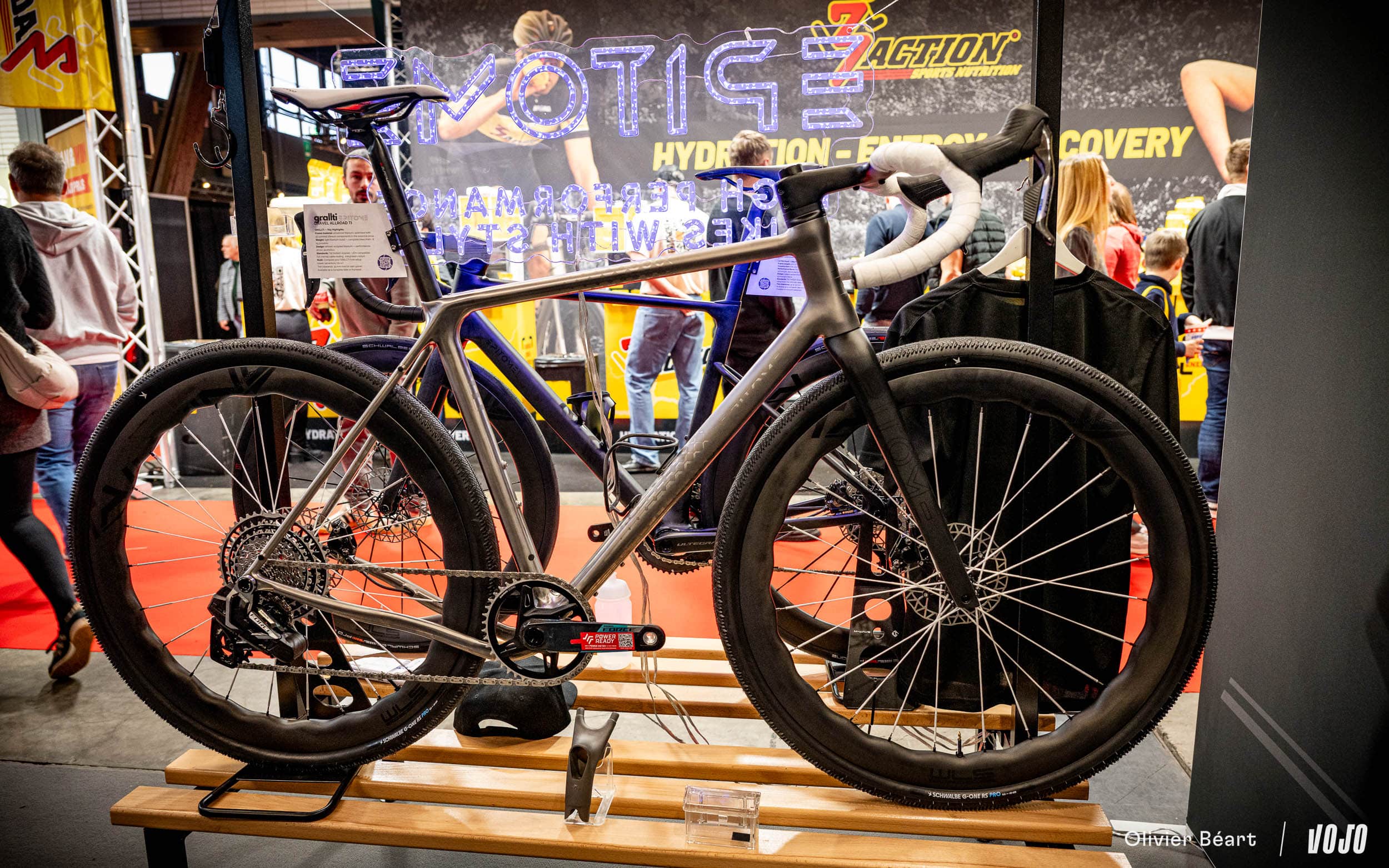 Sur le stand, on pouvait aussi apercevoir les roues montées sur de jolis vélos en carbone et titane d’une nouvelle marque hollandaise baptisée Epitome. Ici, leur modèle GrallTi en titane avec raccord imprimés 3D.
