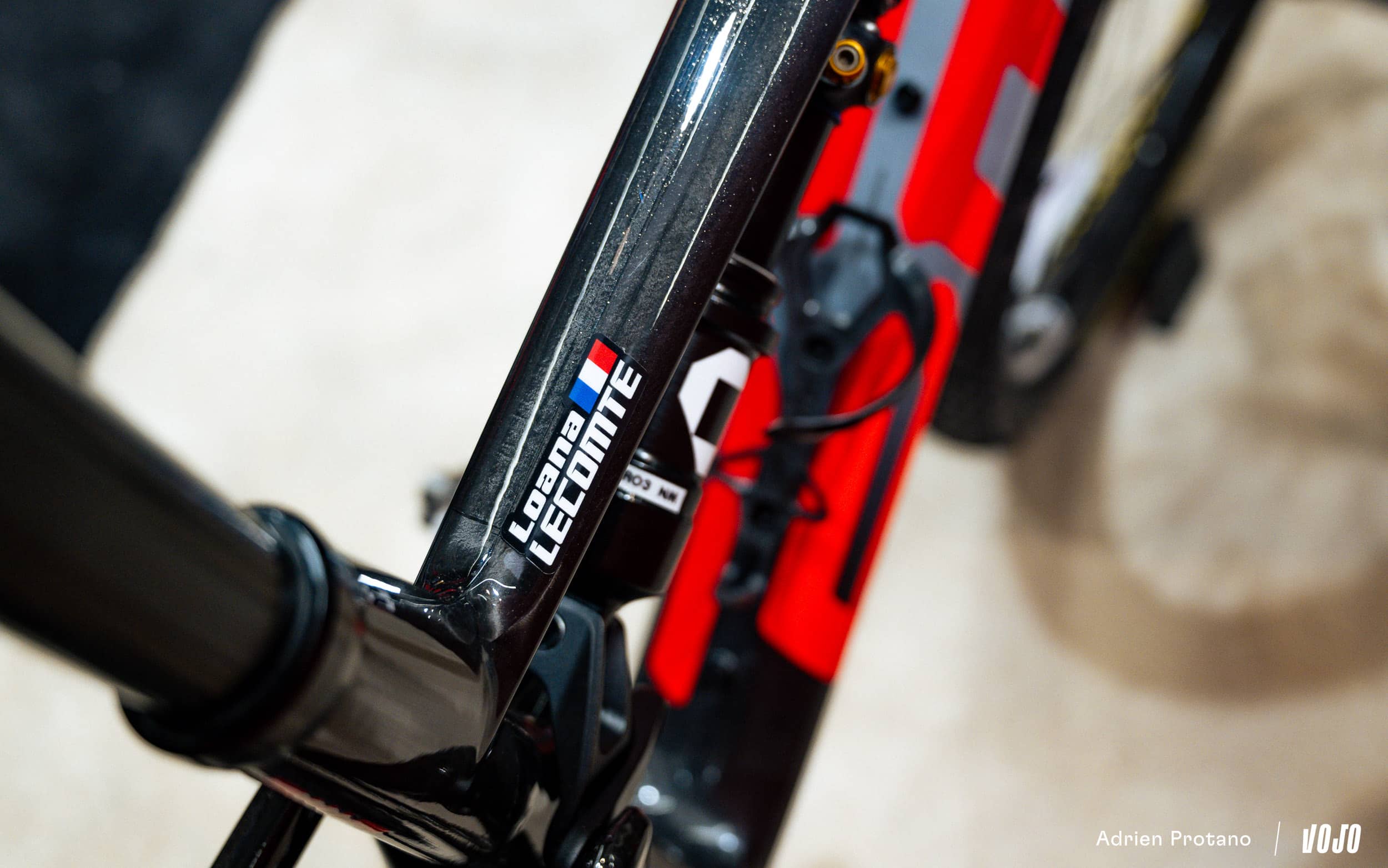 Petit subtilité, c’est ici le vélo de Loana Lecomte qui est exposé, avec les composants partenaires du team XC de coupe du monde de la marque, le BMC Factory Racing.