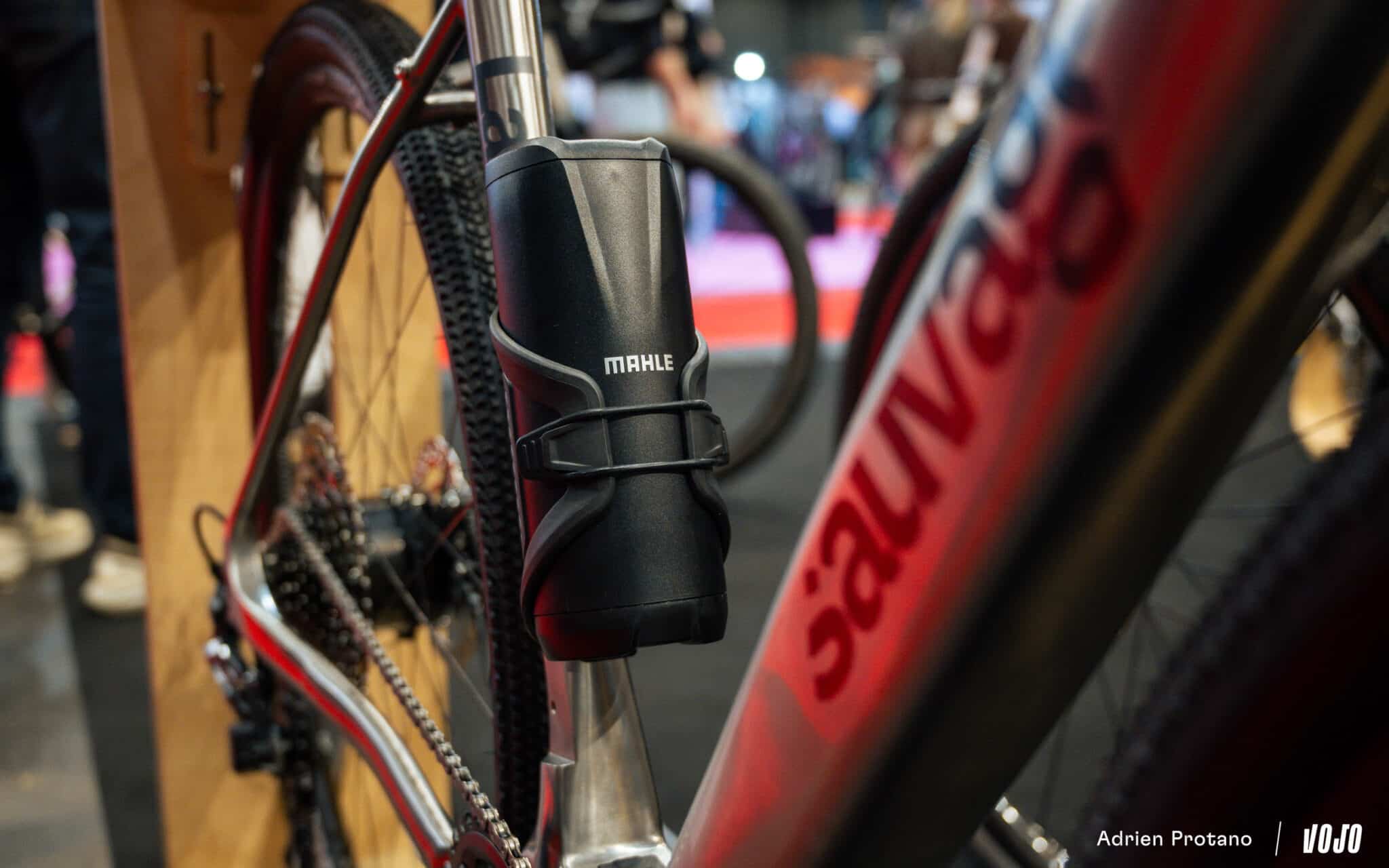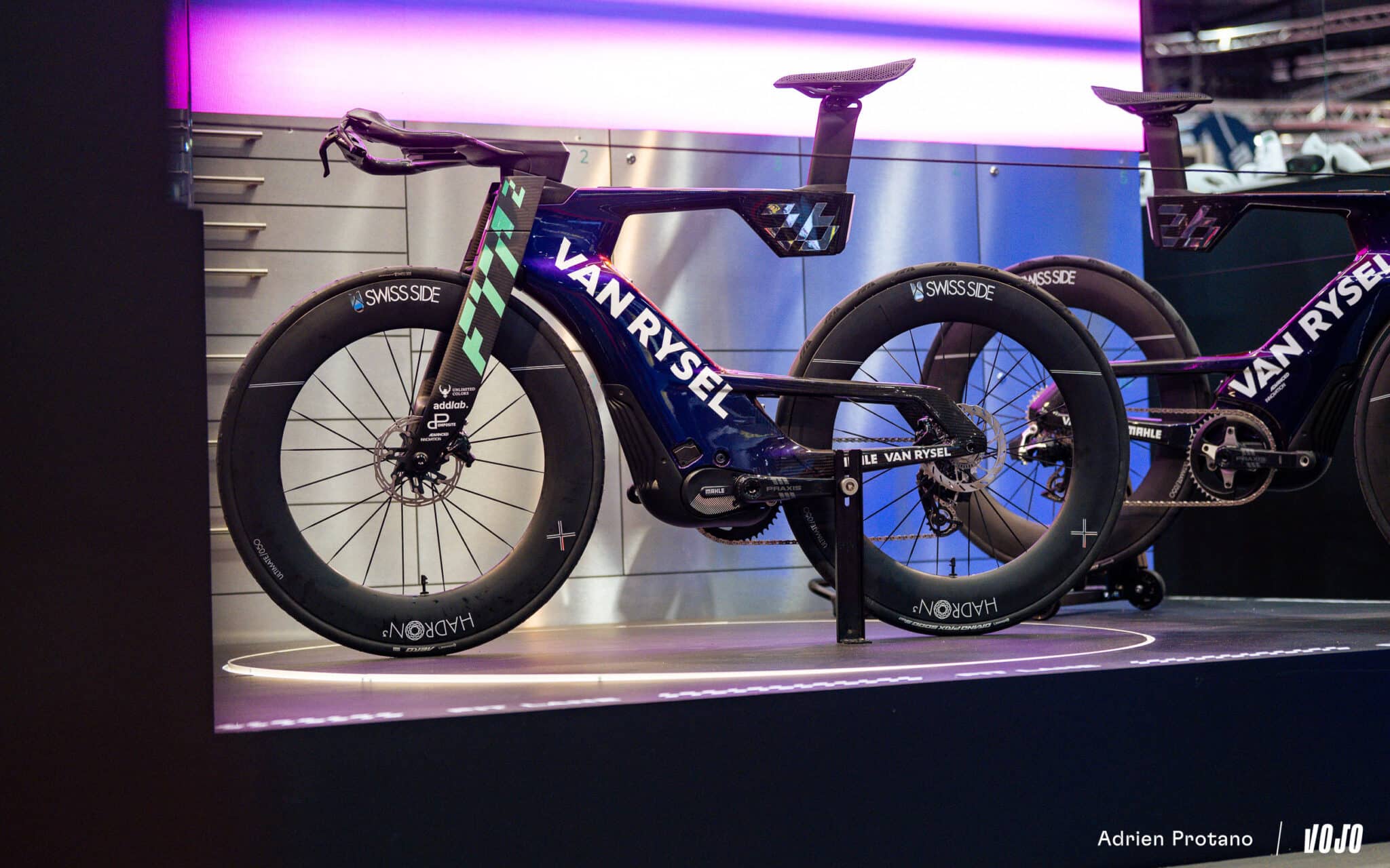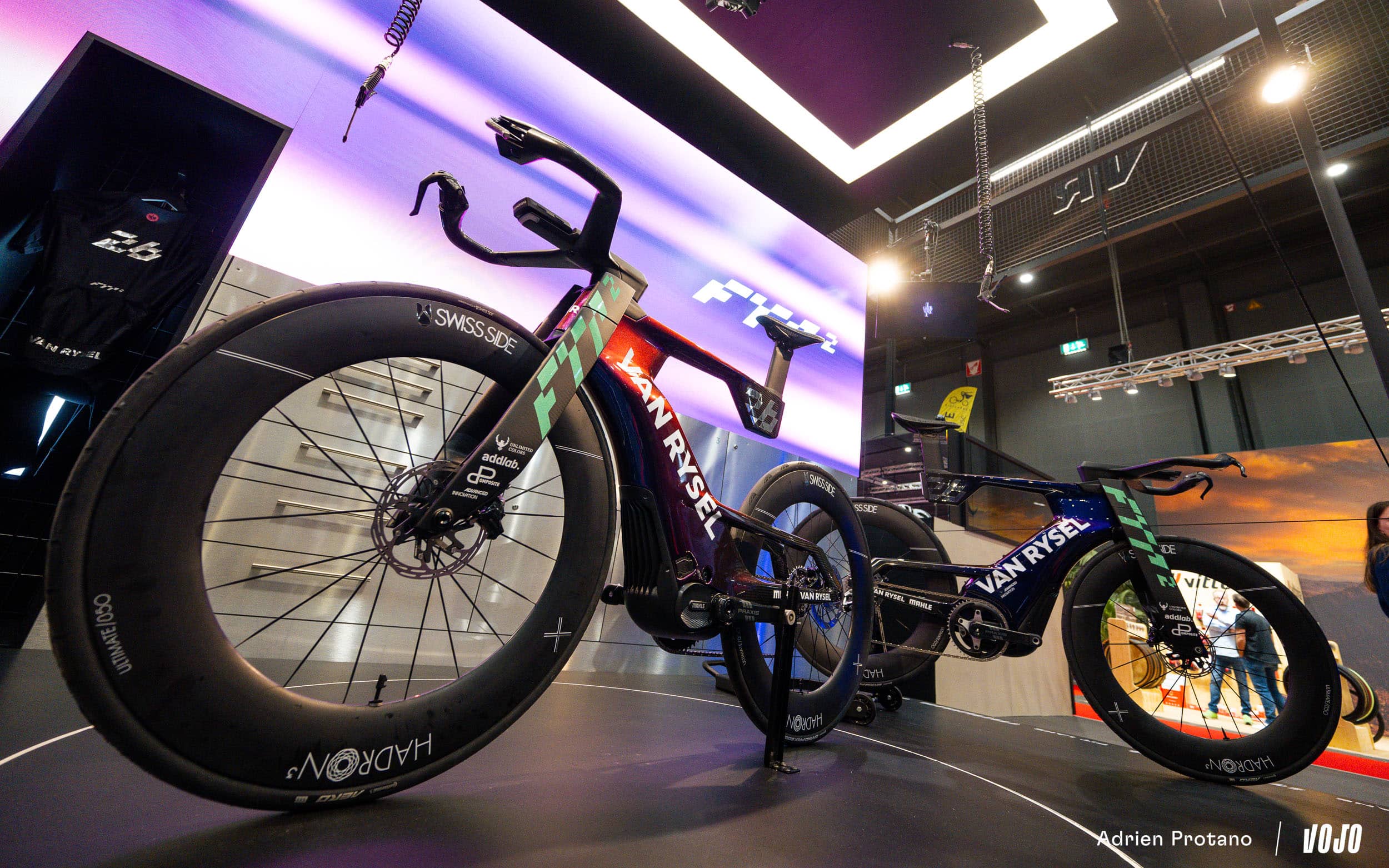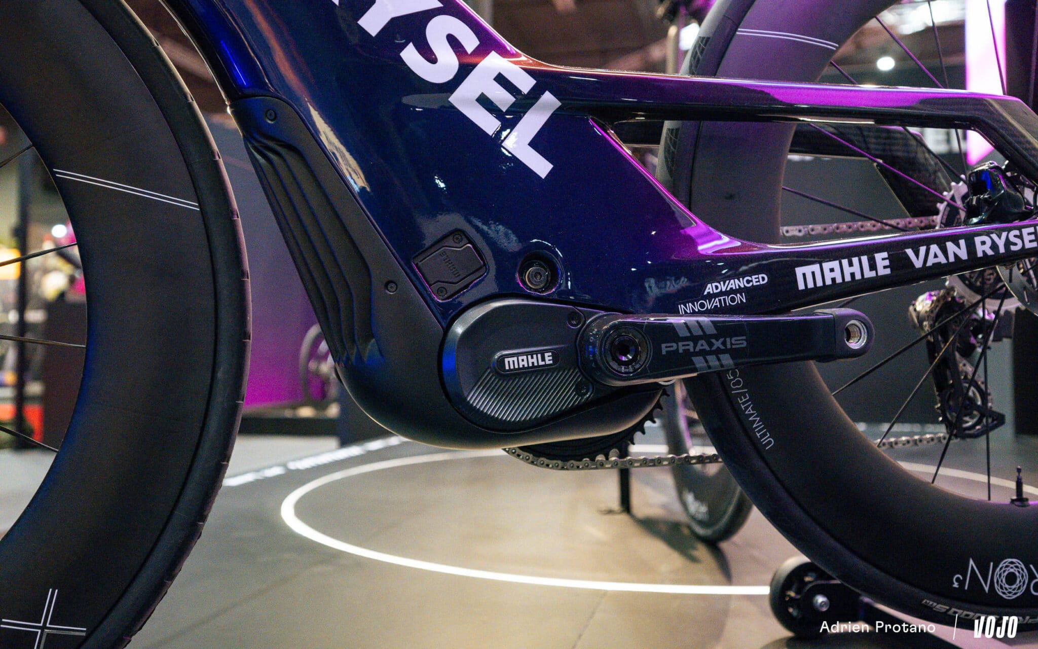 On sort clairement du cadre de chez Vojo, mais impossible de ne pas vous montrer le concept bike présenté par Van Rysel et équipé d’un moteur. On aurait entendu dire qu’il montait jusqu’à 150 km/h… ou plus exactement que le moteur M40 (modifié par rapport à la version de série) permettait de simplement doubler ses watts.