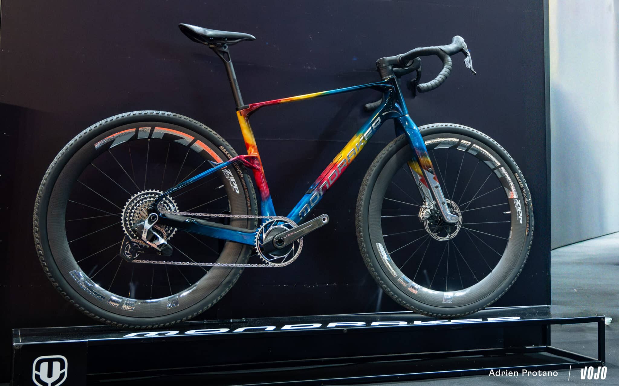 Si vous appréciez les couleurs et/ou les peintures personnalisées, votre bonheur se trouve sur le stand de Mondraker avec cet Arid de gravel à la livrée spéciale « Velofollies ». Il est accompagné de modèles de série et dont la couleur est (cette fois) disponible à la vente.