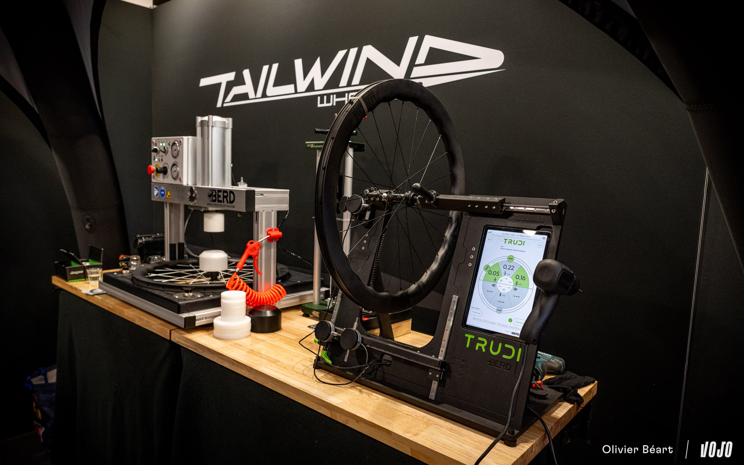 Sur le stand Tailwind – Wheel-Tec, on pouvait voir une machine destinée à faciliter le montage de roues pour les professionnels. Plus simple et moins onéreux que les grosses machines industrielles, ce banc de montage propose une assistance complète au monteur, avec une visseuse qui va l’aider à obtenir très rapidement les bonnes tensions et une roue parfaitement équilibrée. Le banc coûte 8000€ et ensuite un abonnement mensuel permet d’être toujours parfaitement à jour au niveau des différents modèles de jantes/moyeux et rayons, et de bénéficier des améliorations continues du système.