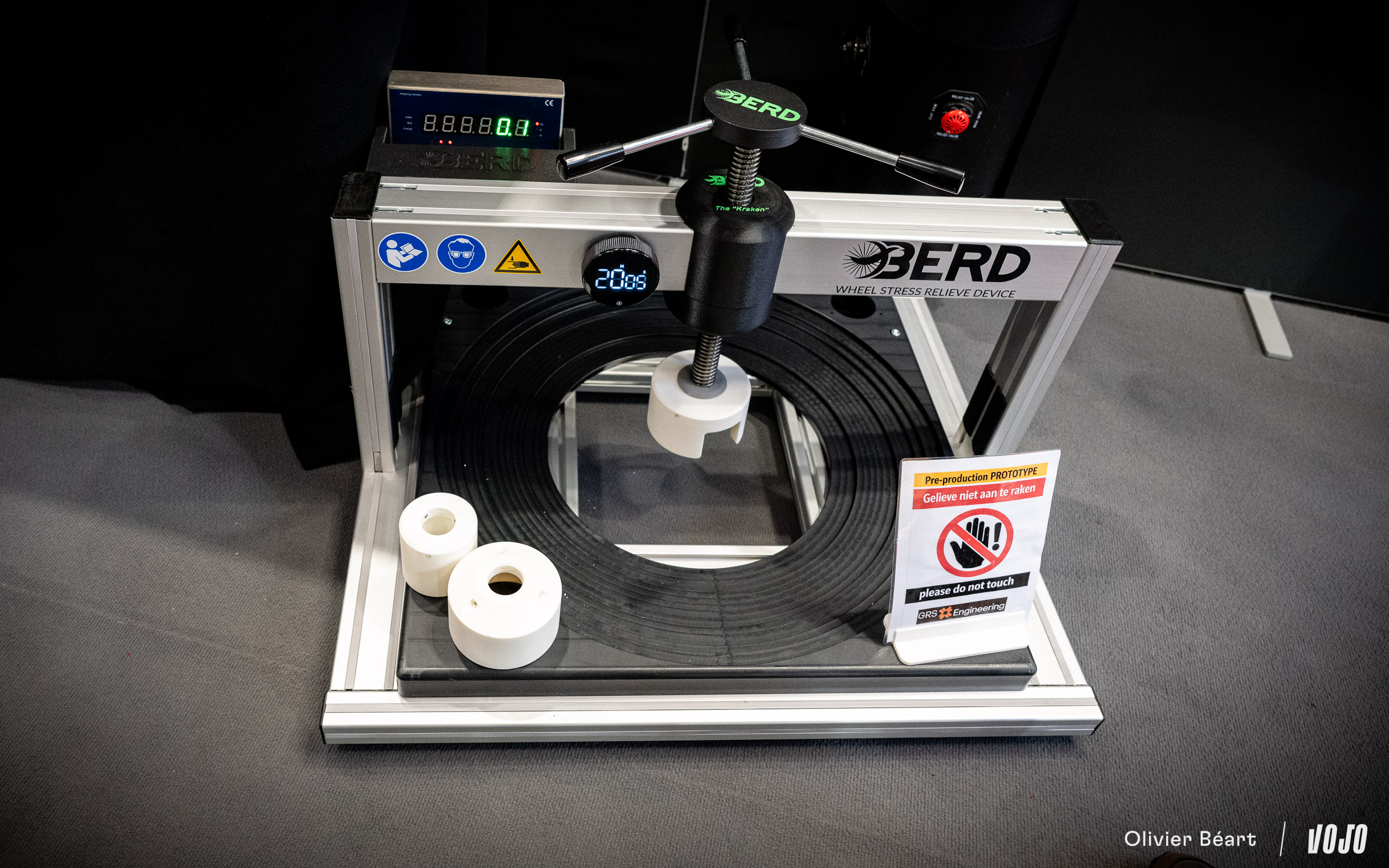 Pour compléter le dispositif, une presse permet de « casser » les roues de manière précise. Par là, il faut entendre qu’n va exercer une contrainte latérale importante pour que les rayons se mettent parfaitement en place et que la roue soit directement stable et durable lorsque l’utilisateur commencera à la rouler. Sans cela, une remise en tension serait nécessaire après les premières sorties. L’outil n’est pas révolutionnaire en soi, mais il a été raffiné par Tailwind.
