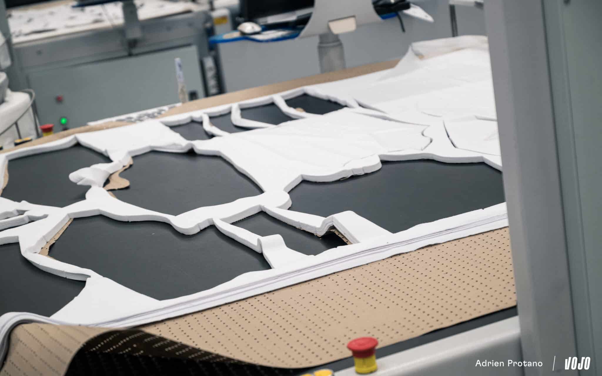 Les machines suivent des patrons numériques qui permettent d’optimiser l’utilisation du tissu et de limiter les pertes. Chaque vêtement est composé de plusieurs panneaux distincts : manches, panneaux latéraux, dos, poches, cuissard, bretelles, etc. Les machines viennent découper ces pièces avec une précision millimétrique.