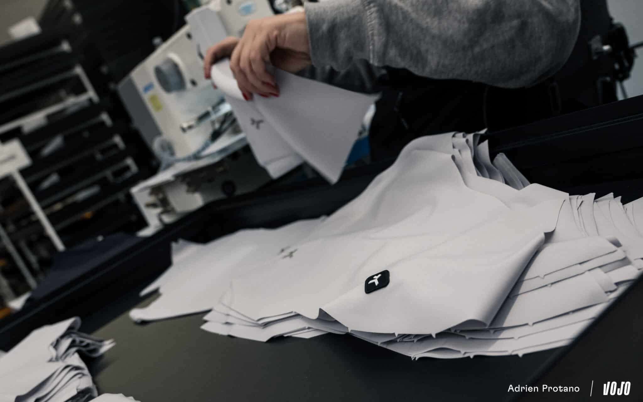 C’est ici que la magie opère. Les feuilles imprimées sont placées sur le tissu blanc, puis l’ensemble passe dans une presse chauffante. Sous l’effet de la chaleur et de la pression, l’encre se transforme en gaz et pénètre directement dans les fibres du tissu. Le motif devient alors littéralement une partie du textile. Une technique qui nous rappelle notre visite des locaux de Tactic : Visite | Tactic Sport : comment on fabrique un maillot de vélo ?