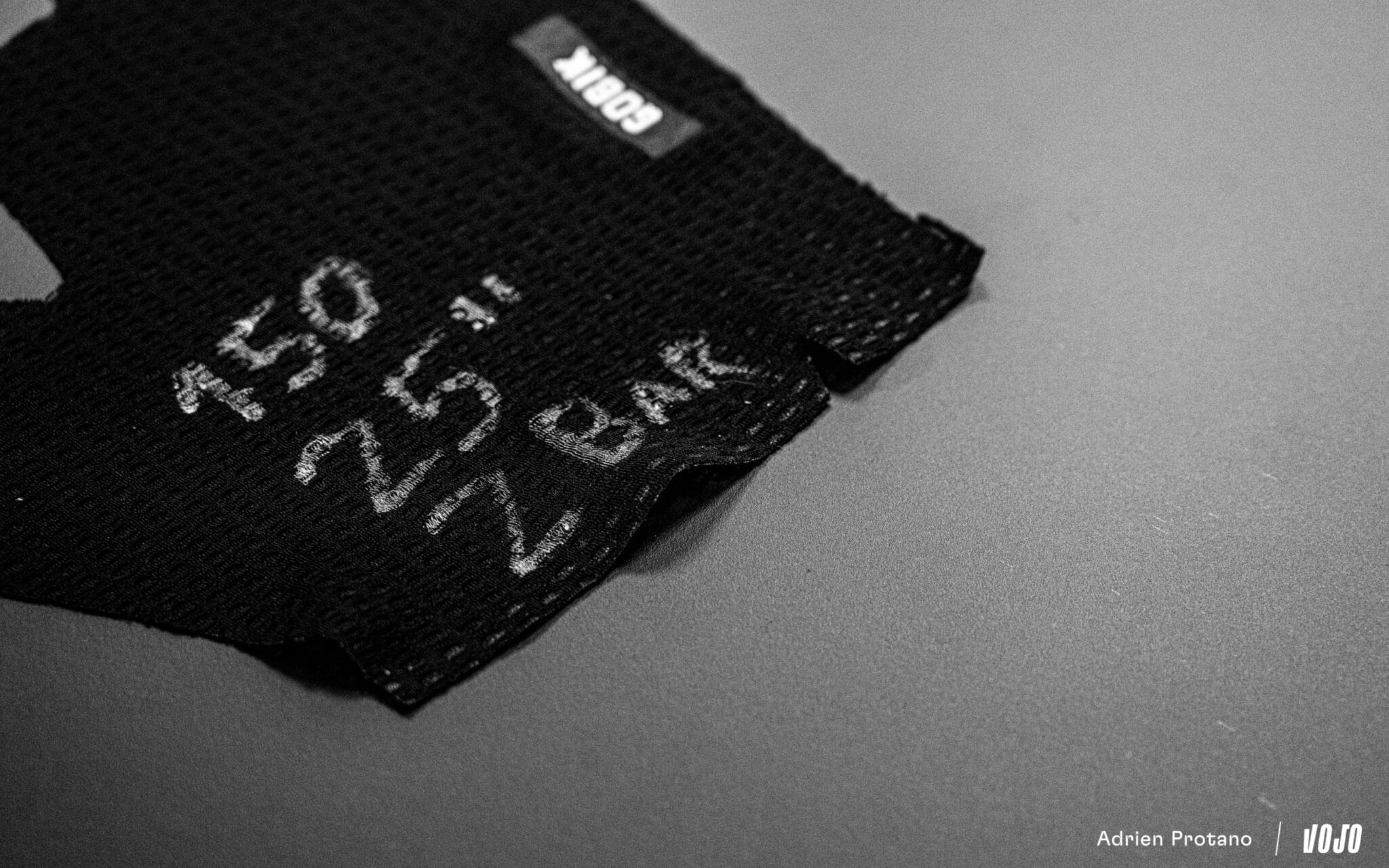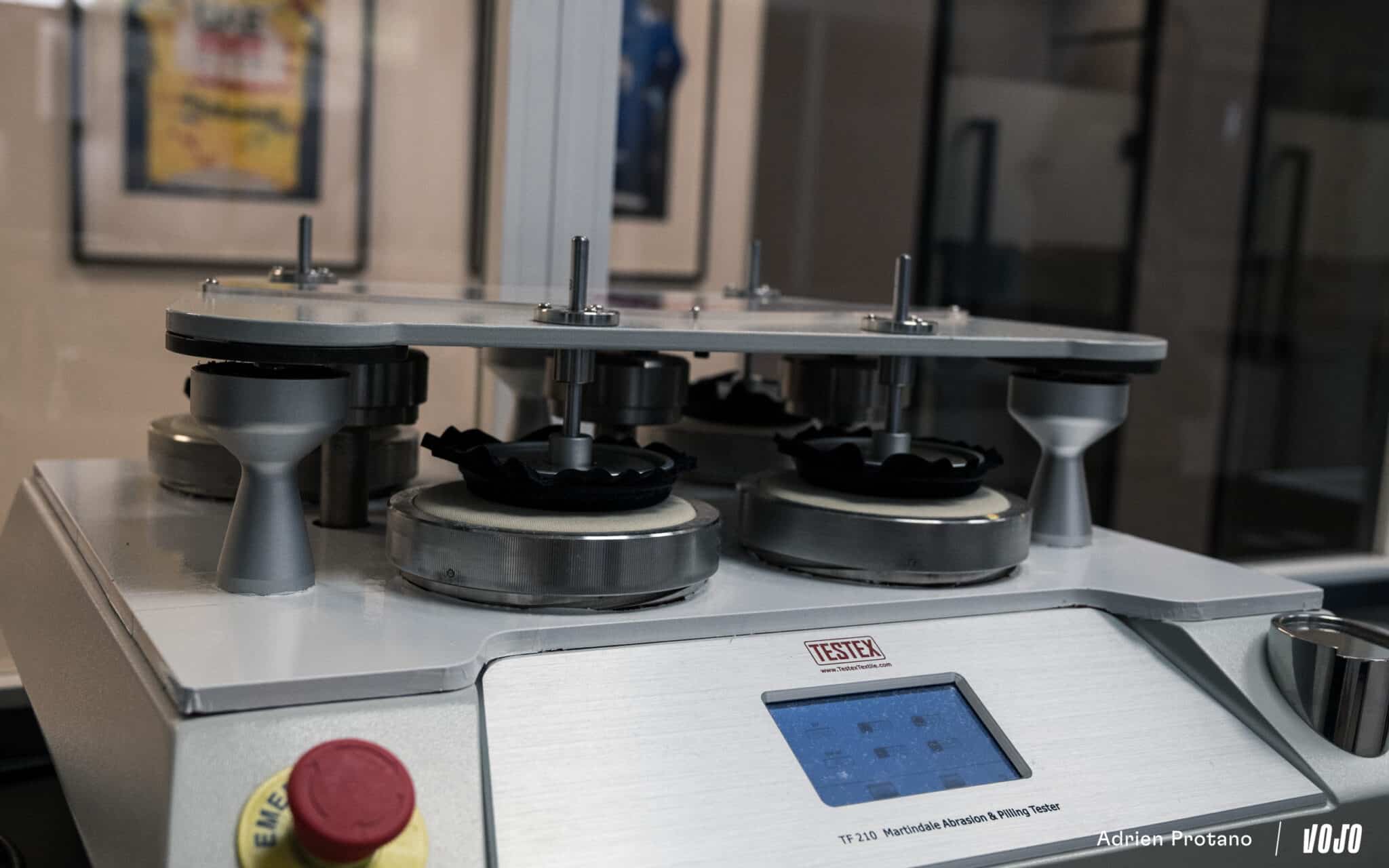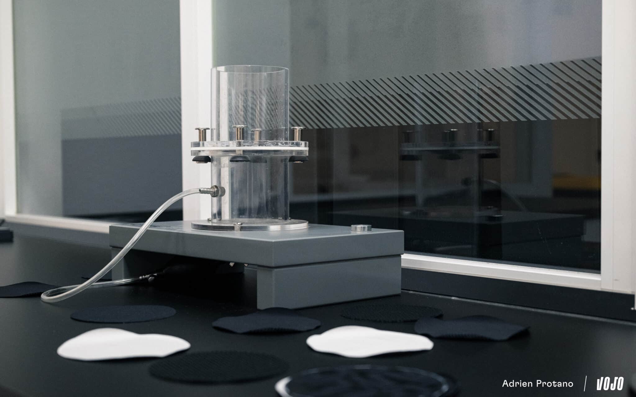 Avant même la production, la première étape consiste à choisir les matériaux. Dans le laboratoire de l’usine, Gobik teste longuement les tissus avant de les intégrer dans une collection. Certains tests consistent par exemple à reproduire la friction d’un cuissard contre la selle pendant plusieurs heures, afin d’observer l’usure du textile. Les vêtements techniques utilisés en cyclisme sont généralement composés de polyester, polyamide et élasthanne, des fibres synthétiques qui offrent respirabilité, élasticité et résistance à l’usure, mais la marque cherche constamment à faire évoluer les matériaux utilisés.
