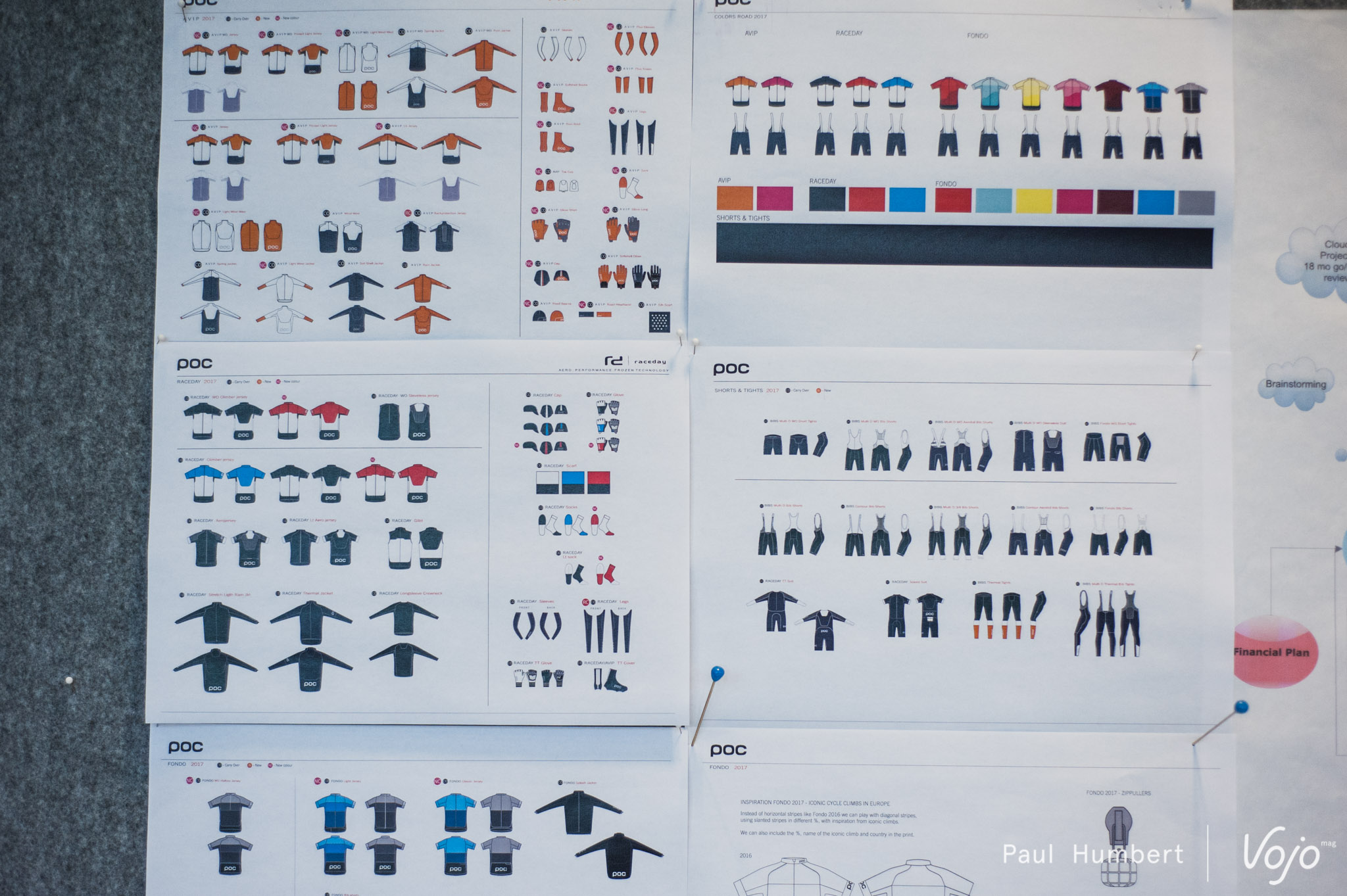 Entre harmonie, sobriété, impératif de visibilité et tendances, il est difficile de définir les bonnes couleurs pour les produits. Les idées sont inspirées par la nature mais également par le cyclisme dans le cas de la gamme cross-country. Les couleurs « fluo » sont éliminées des lignes « raceday » où les impératifs de visibilité sont moins grands. Pour les casques, le travail de design se fait en collaboration avec les ingénieurs car chacun doit penser à servir la cause de l’autre. Quand on se penche sur les coupes des vêtements, on apprend que l’influence de Manuel Fumic a joué son rôle dans le développement de shorts pour les pratiques XC que POC considère comme un gain de sécurité.