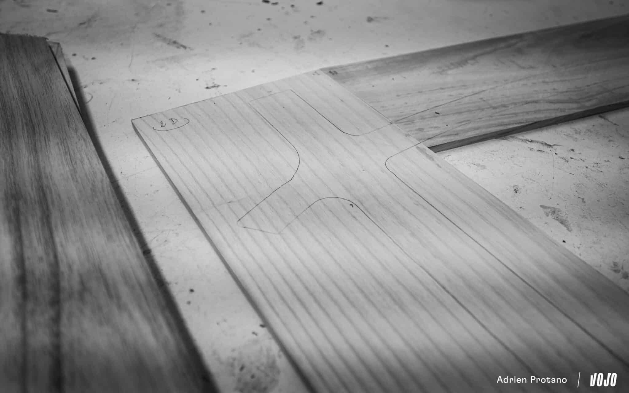 Grâce à un dessin 3D de son cadre, ce dernier est usiné avec une fraiseuse numérique. Celle-ci vient découper avec une grande précision le cadre dans ces planches assemblées. C’est en réalité un processus en deux étapes puisque cet assemblage de planches ne crée qu’un seul demi-cadre.
