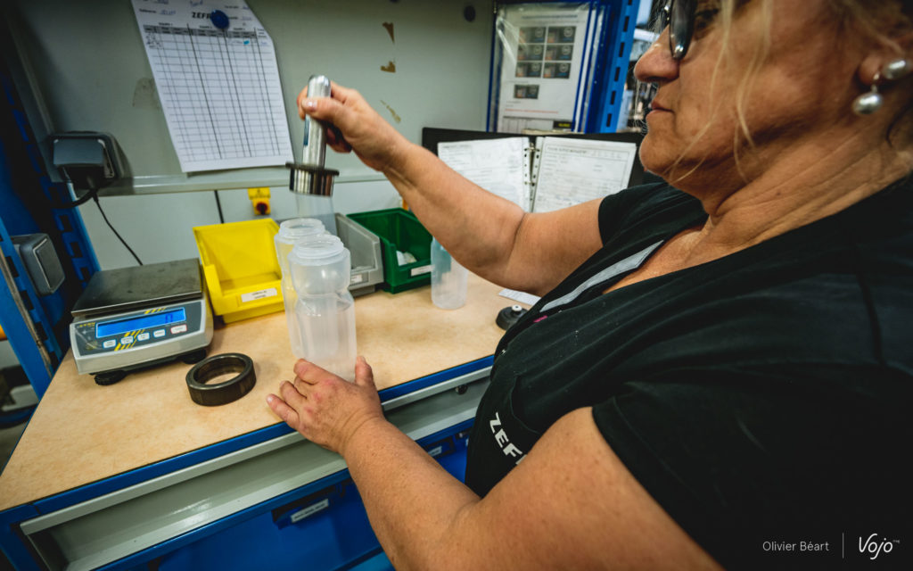 Lors de l’assemblage final, une opération encore largement manuelle, on constate que ces possibilités de personnalisation séduisent de très prestigieux clients, comme ici un des magasins officiels du Tour de France, qui commande ses bidons chez Zéfal.
