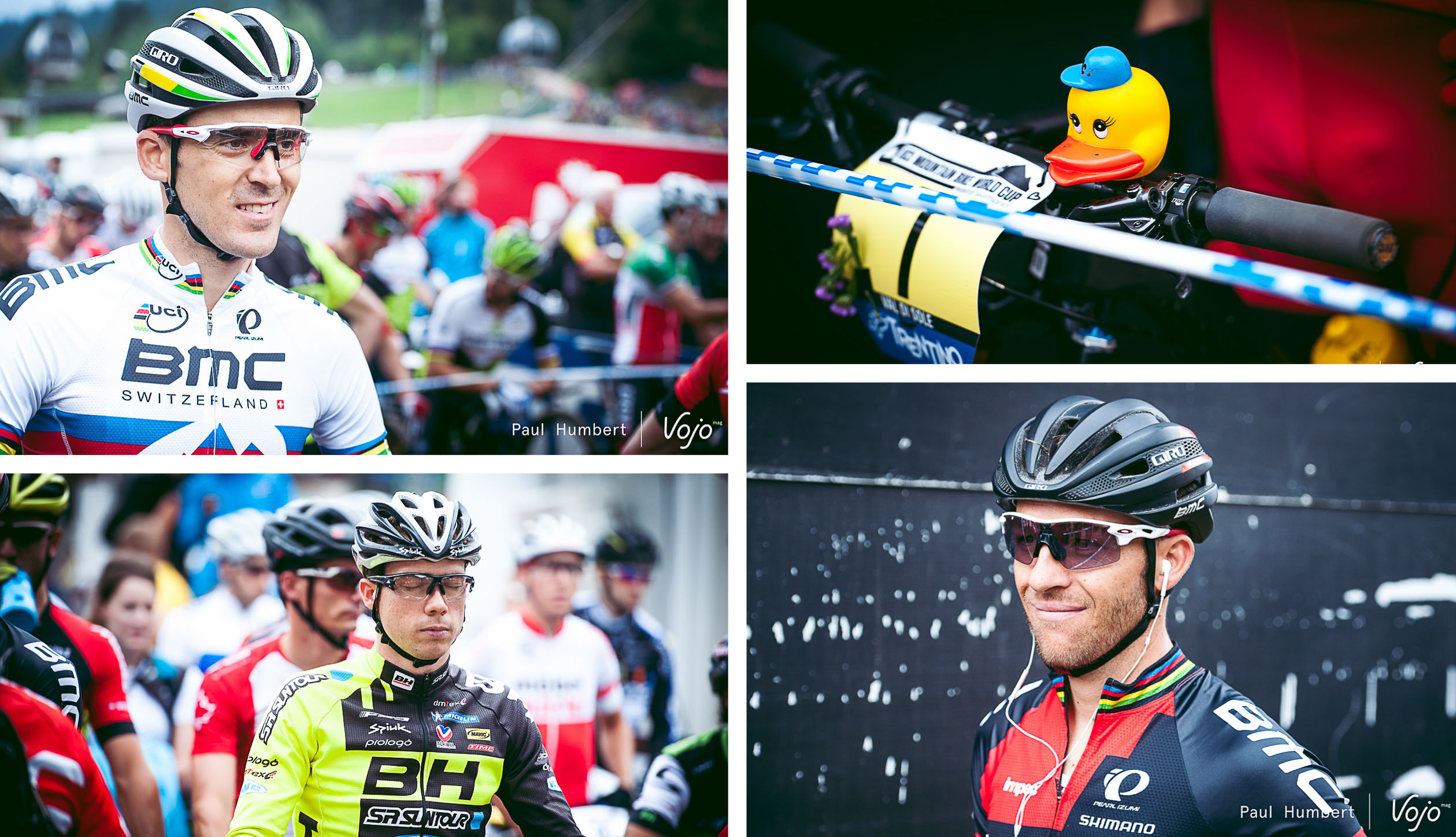 Sur la ligne, Julien Absalon est souriant. Il sait que la forme est au rendez-vous. Fidèle à son habitude, Maxime Marotte se concentre profondément. Quant à Ralph Naef, il savoure ces instants très particuliers : il s’agit de sa dernière Coupe du Monde ! Sur son cintre, en plus d’un petit canard/klaxon, une petite fleur collée sur sa plaque de cadre rappelle qu’il y a un an tout juste, Annefleur Kalvenhaar nous quittait suite à un dramatique accident lors de la course XCE. Tous les coureurs ont arboré ce symbole sur leur plaque pendant le week-end en guise d’hommage.