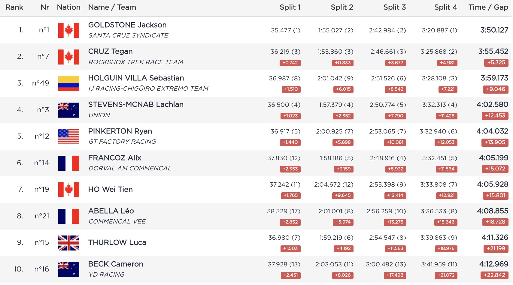 Intouchable hier en qualifications, Jackson Goldstone a poursuivi sur sa lancée et s’impose facilement en finale. Il relègue son compatriote Tegan Cruz à plus de 5 secondes alors que Sebastian Holguin Villa, 3e, est à plus de 9 secondes.