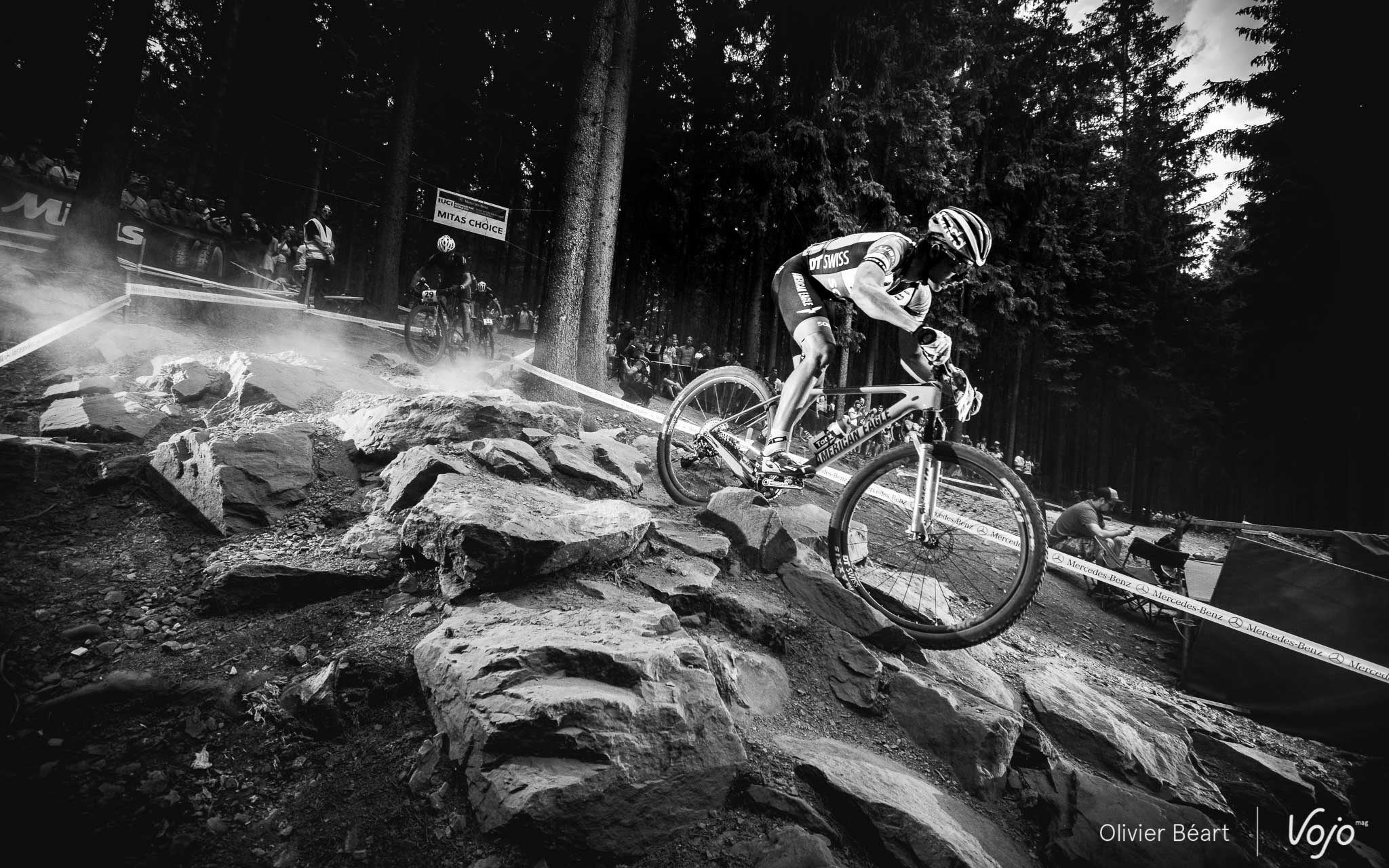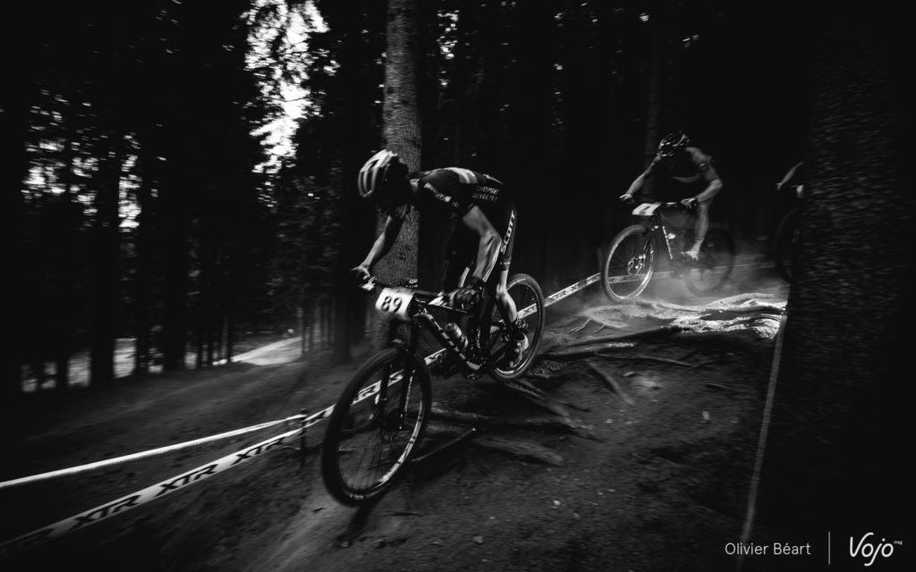 Nove Mesto est un de circuits les plus réputés de la coupe du Monde XC. Un des plus appréciés. Mais aussi un des plus craints car il peut se montrer implacable. Son décor : une épaisse forêt de pins aux pentes raides. Le relief est naturel, les racines aussi, mais la main de l’homme est venue y ajouter des pierriers aussi spectaculaires que complexes à négocier, même pour les meilleurs. Chaque année depuis la création du magazine, Vojo est présent sur place pour vous faire vivre l’événement. Cette édition 2018, intense, dramatique, indécise, c’est au moyen de noirs et blancs profonds que nous avons voulu vous la montrer. Car sans couleurs, une autre histoire se dévoile.